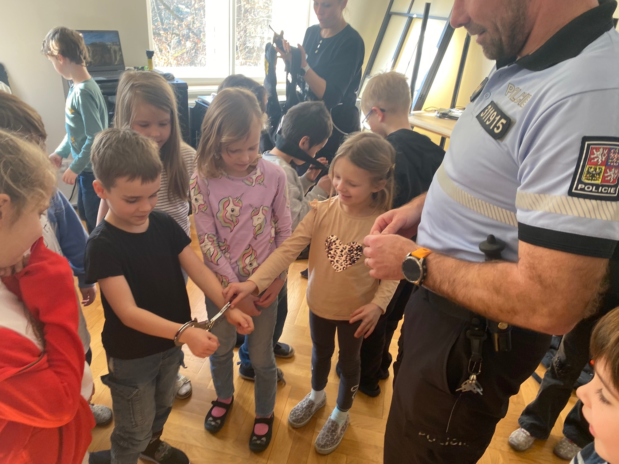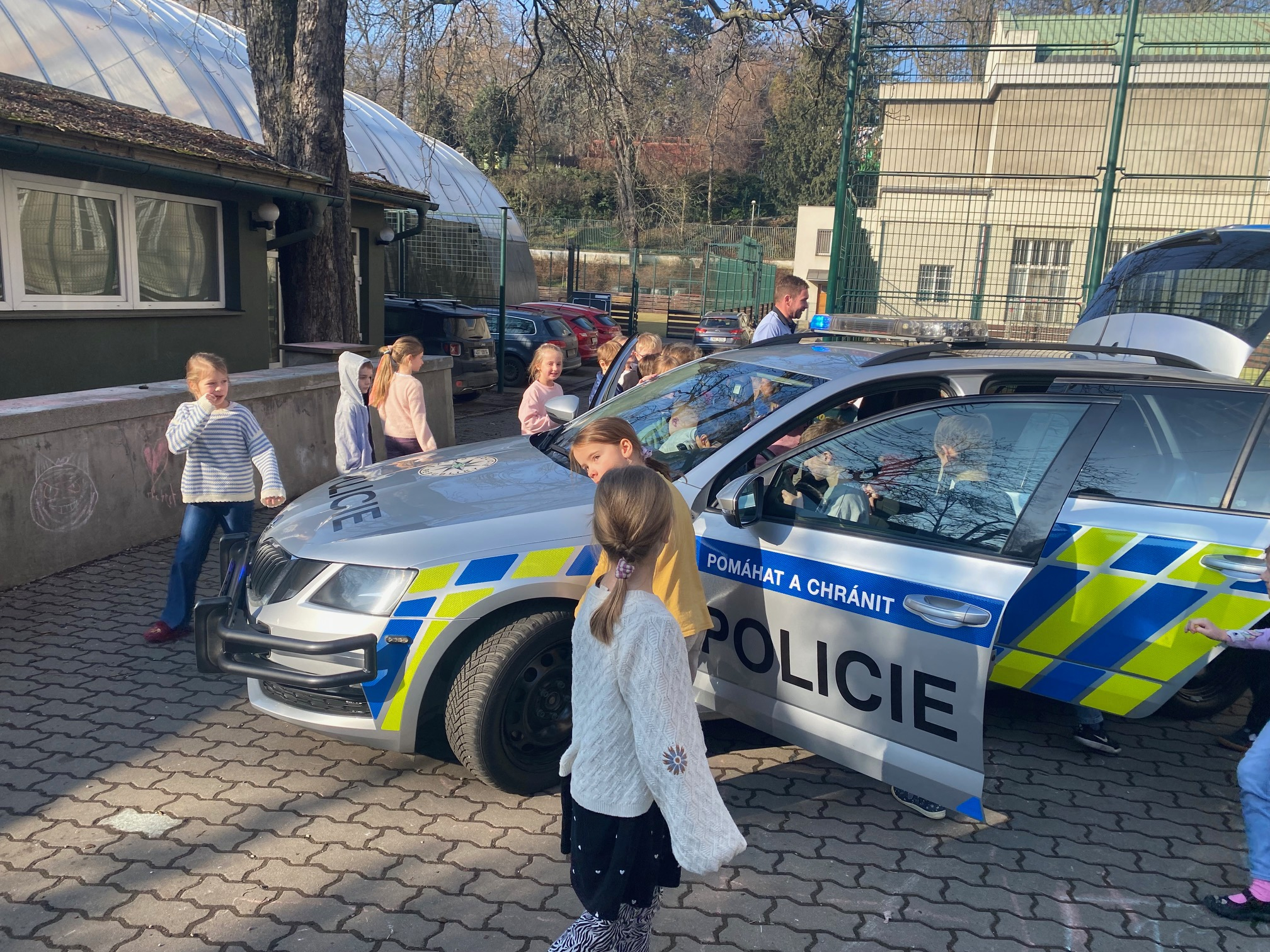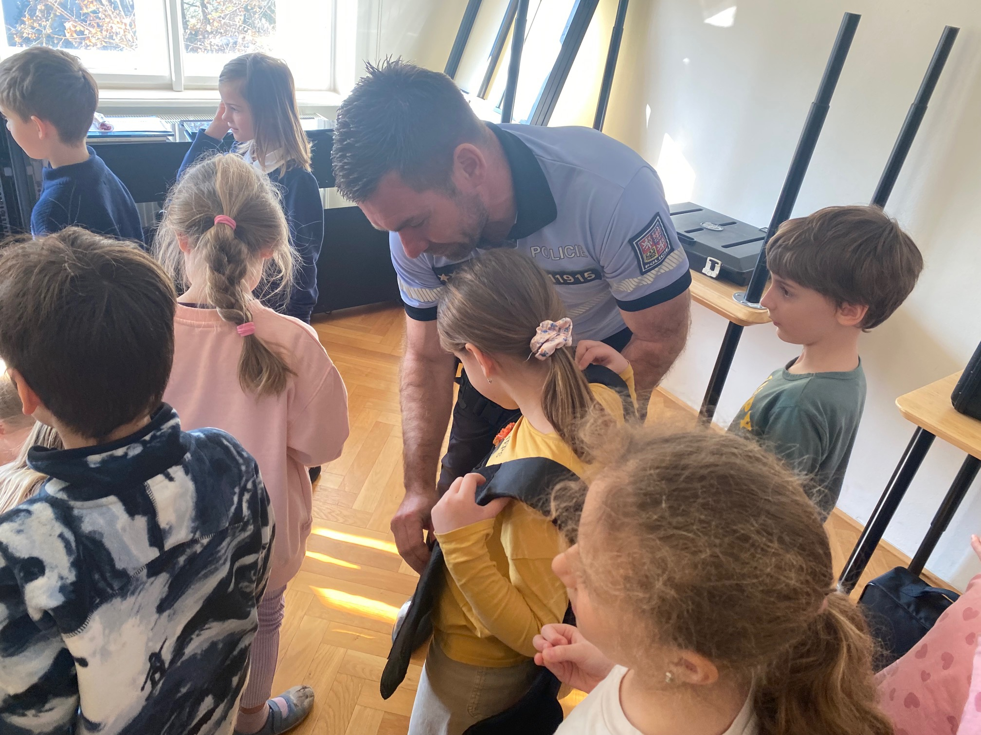 Besedu nám zpestřila videa i možnost prohlédnout si zblízka vybavení policistů a policejní auto.