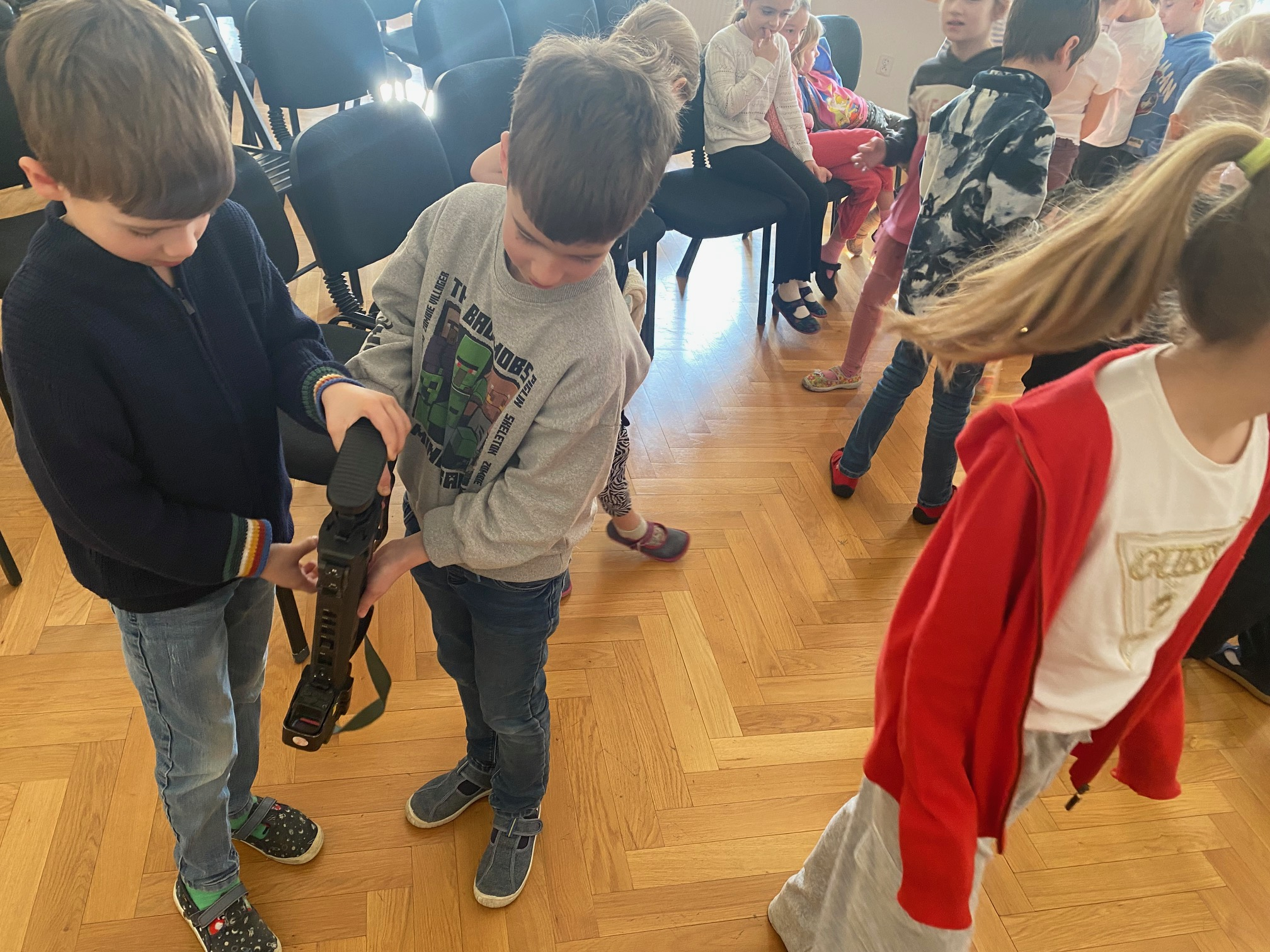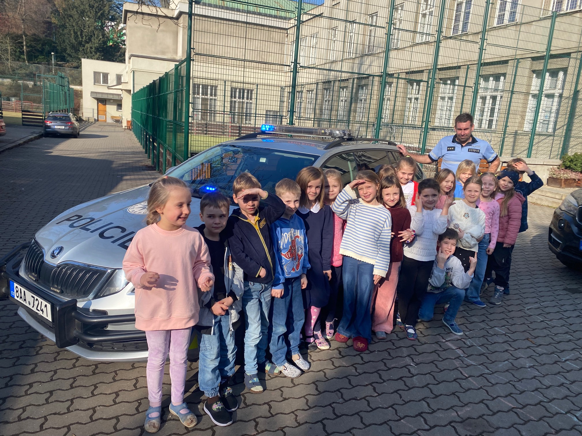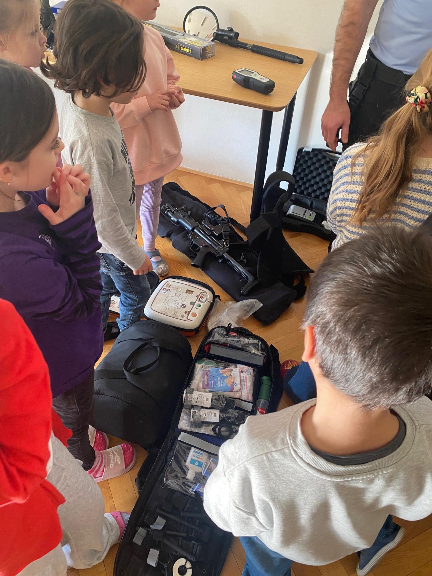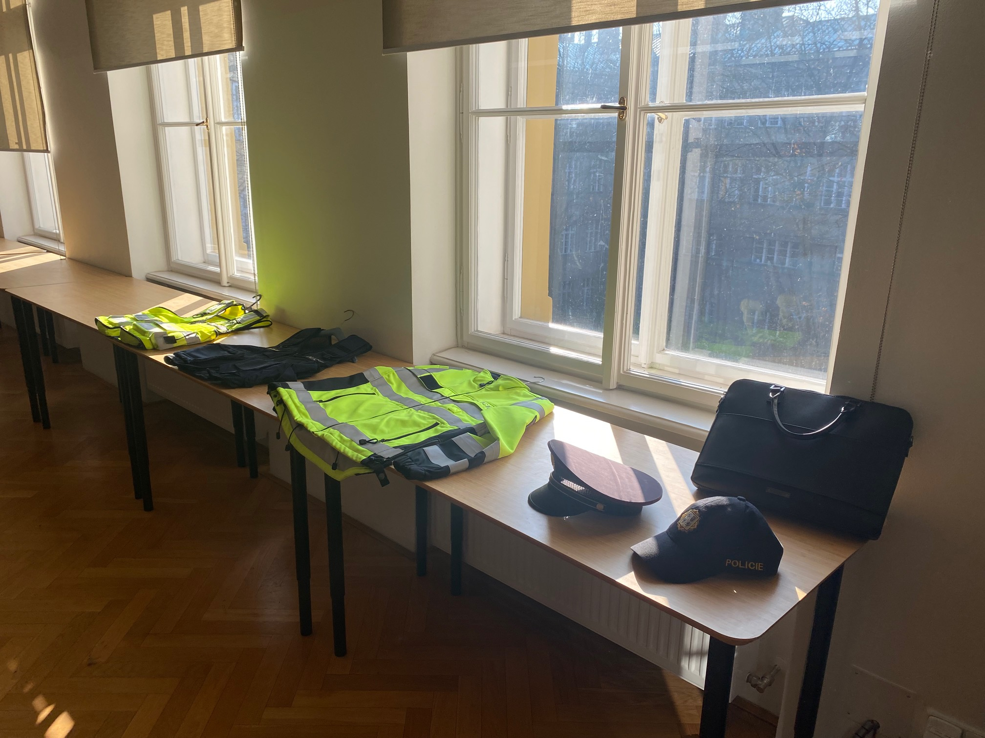 Besedu nám zpestřila videa i možnost prohlédnout si zblízka vybavení policistů a policejní auto.