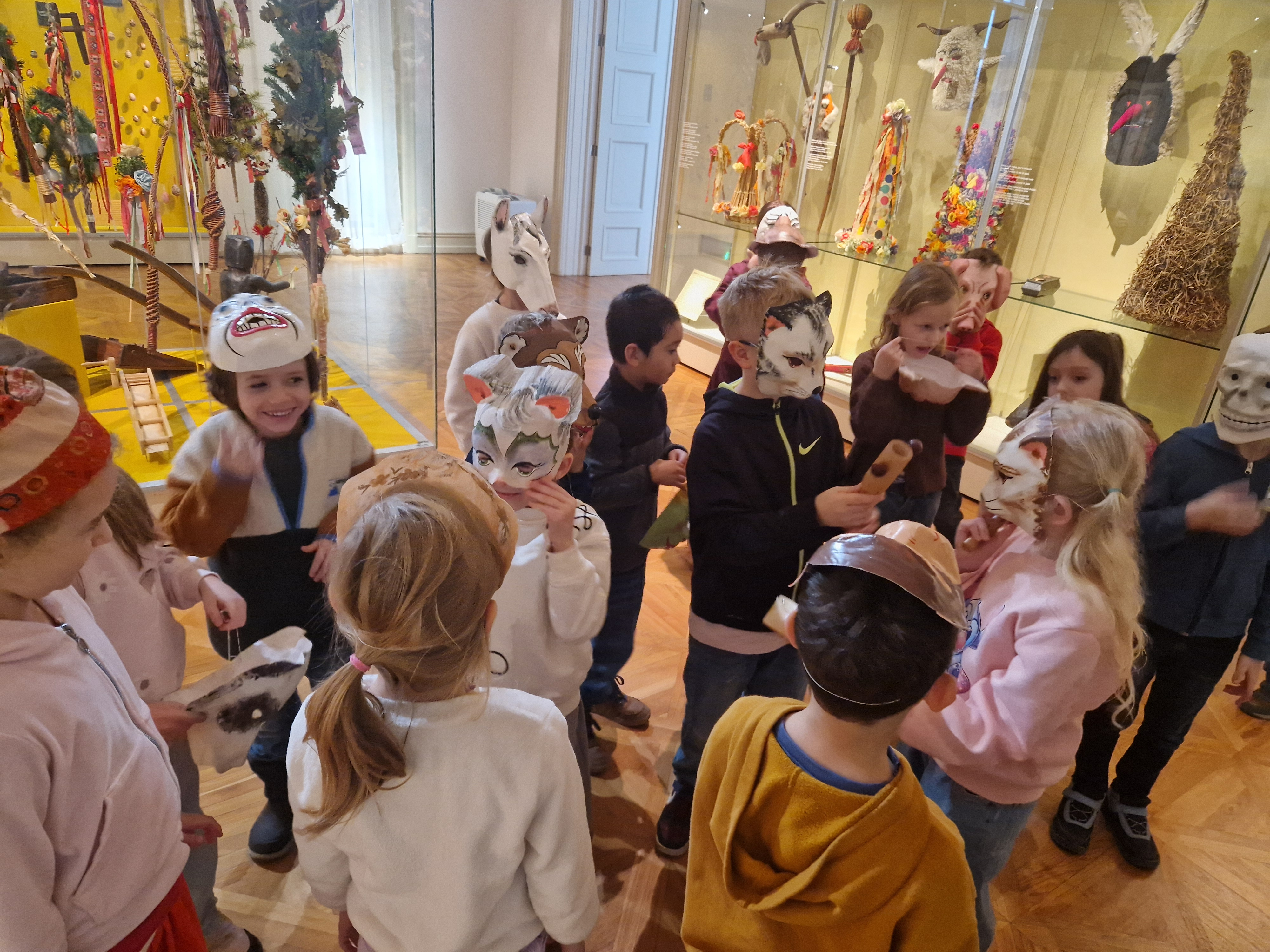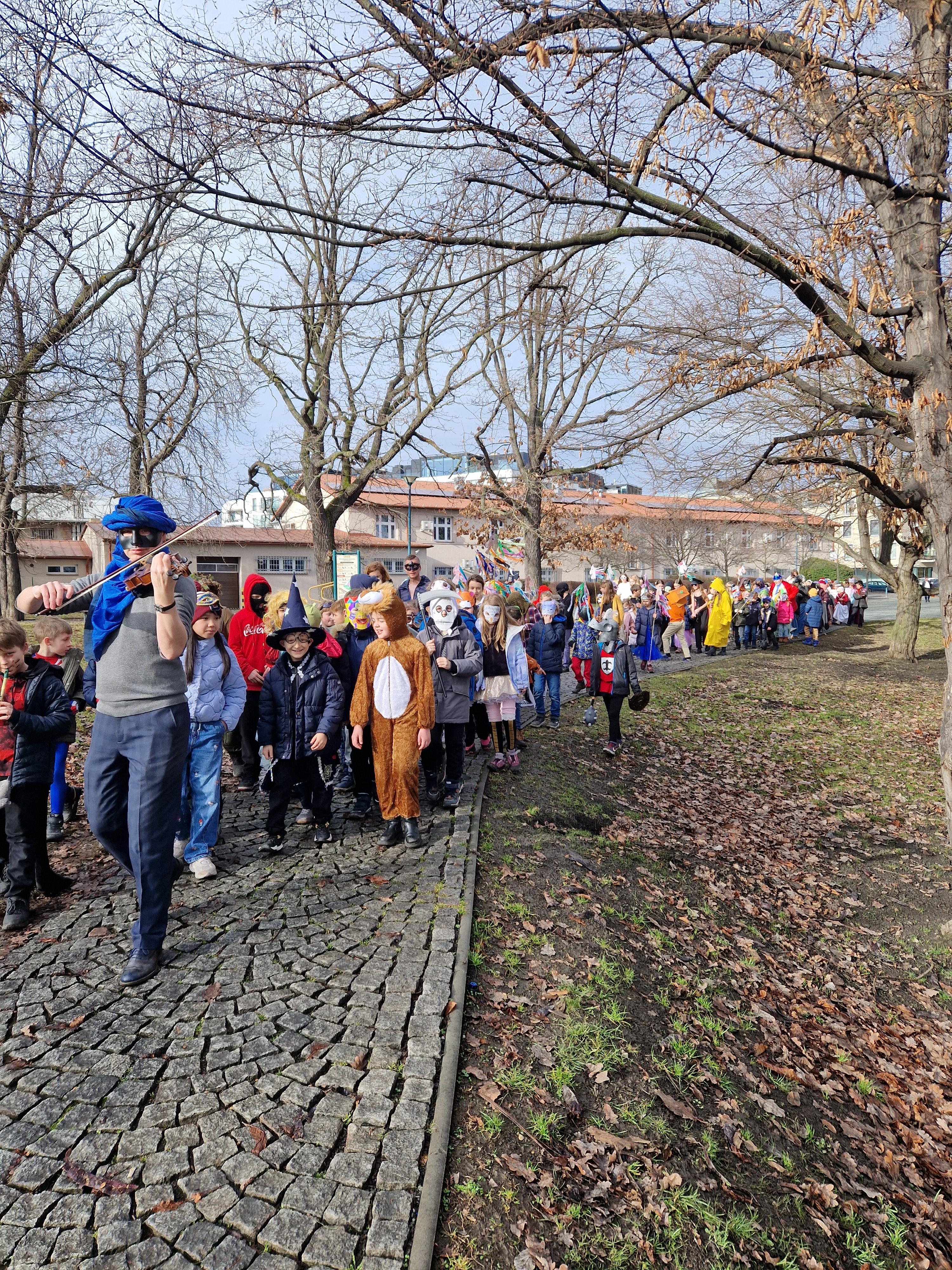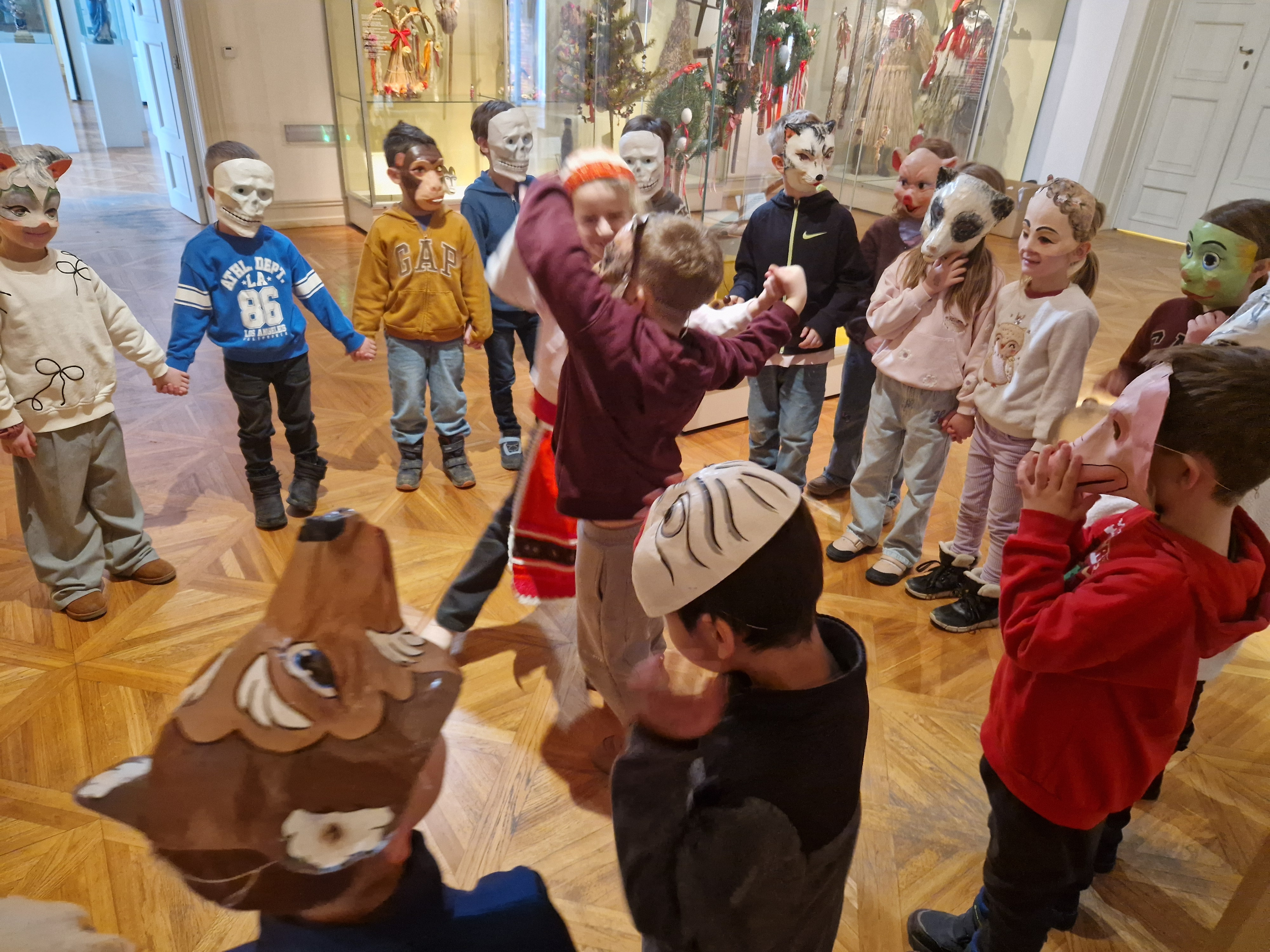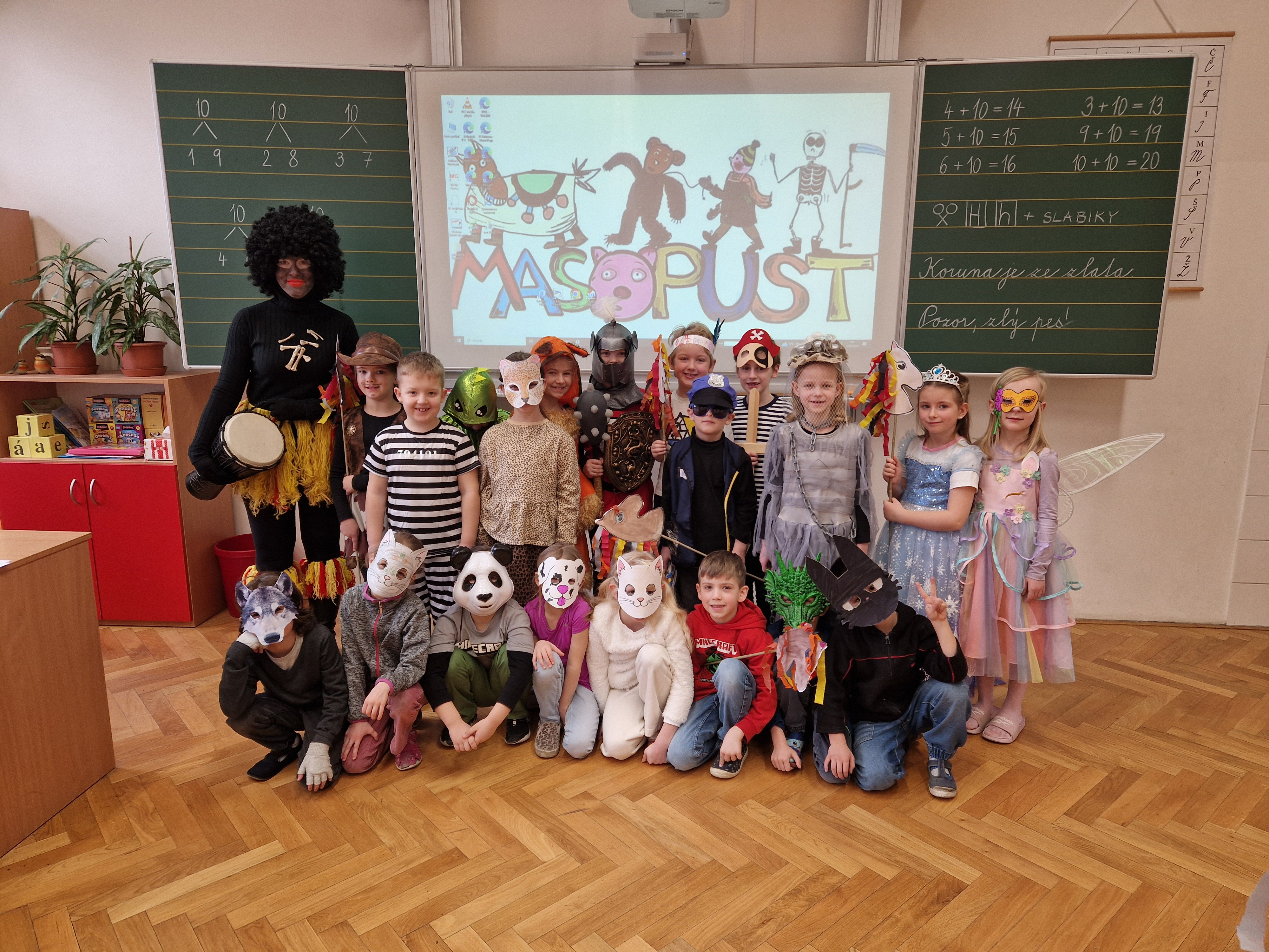 Nejen tuto říkanku, ale i mnoho dalšího ze zvyků masopustu jsme se naučili při návštěvě Musaionu. Vyzkoušeli jsme si i podšable, tradiční tanec spjatý s fašankem na Slovácku. Období masopustu jsme pak ukončili pořádnou oslavou. Veselili jsme se a tancovali na chodbách školy a pořádali průvod maškar parkem Sacré Coeur.
