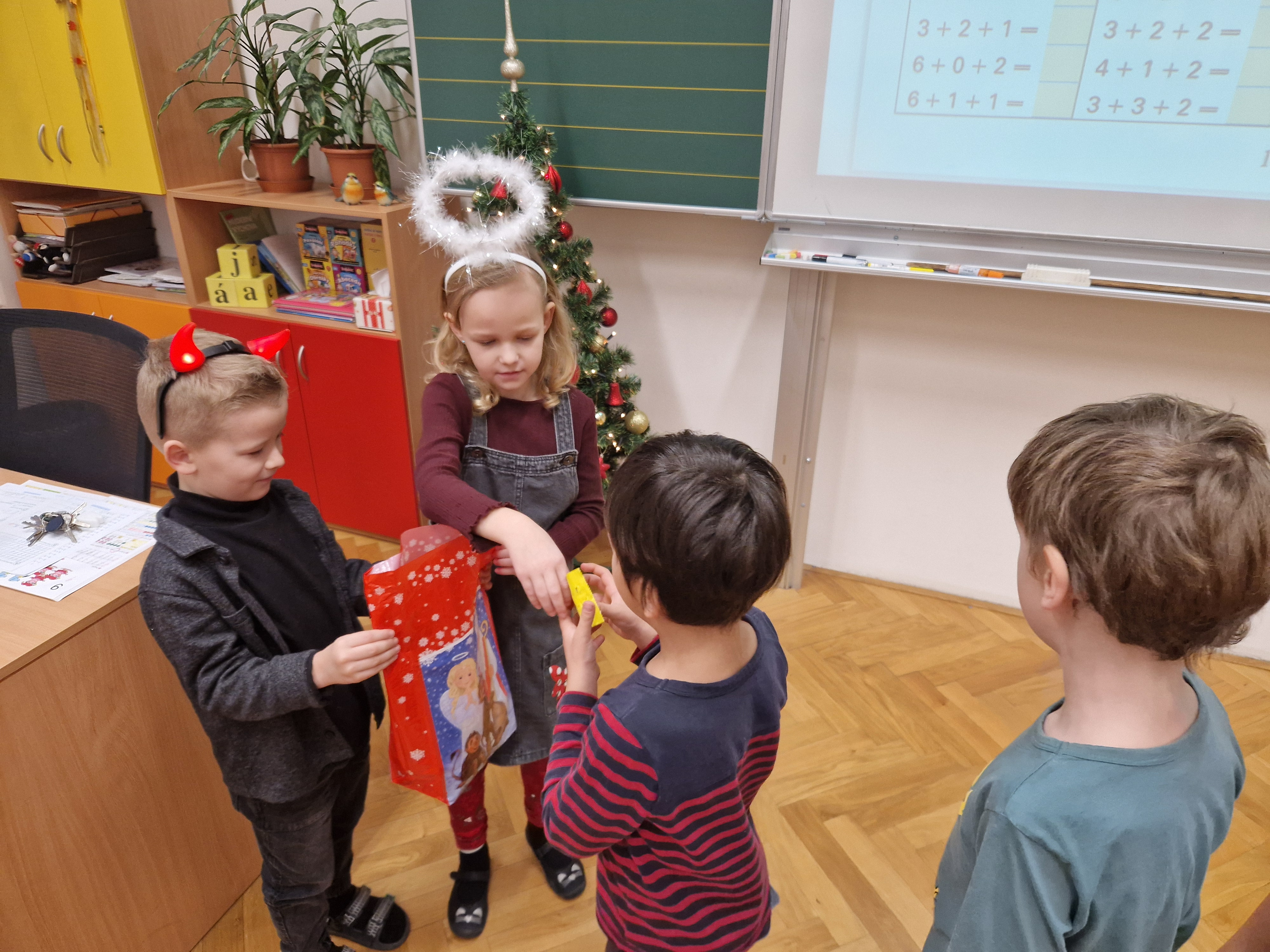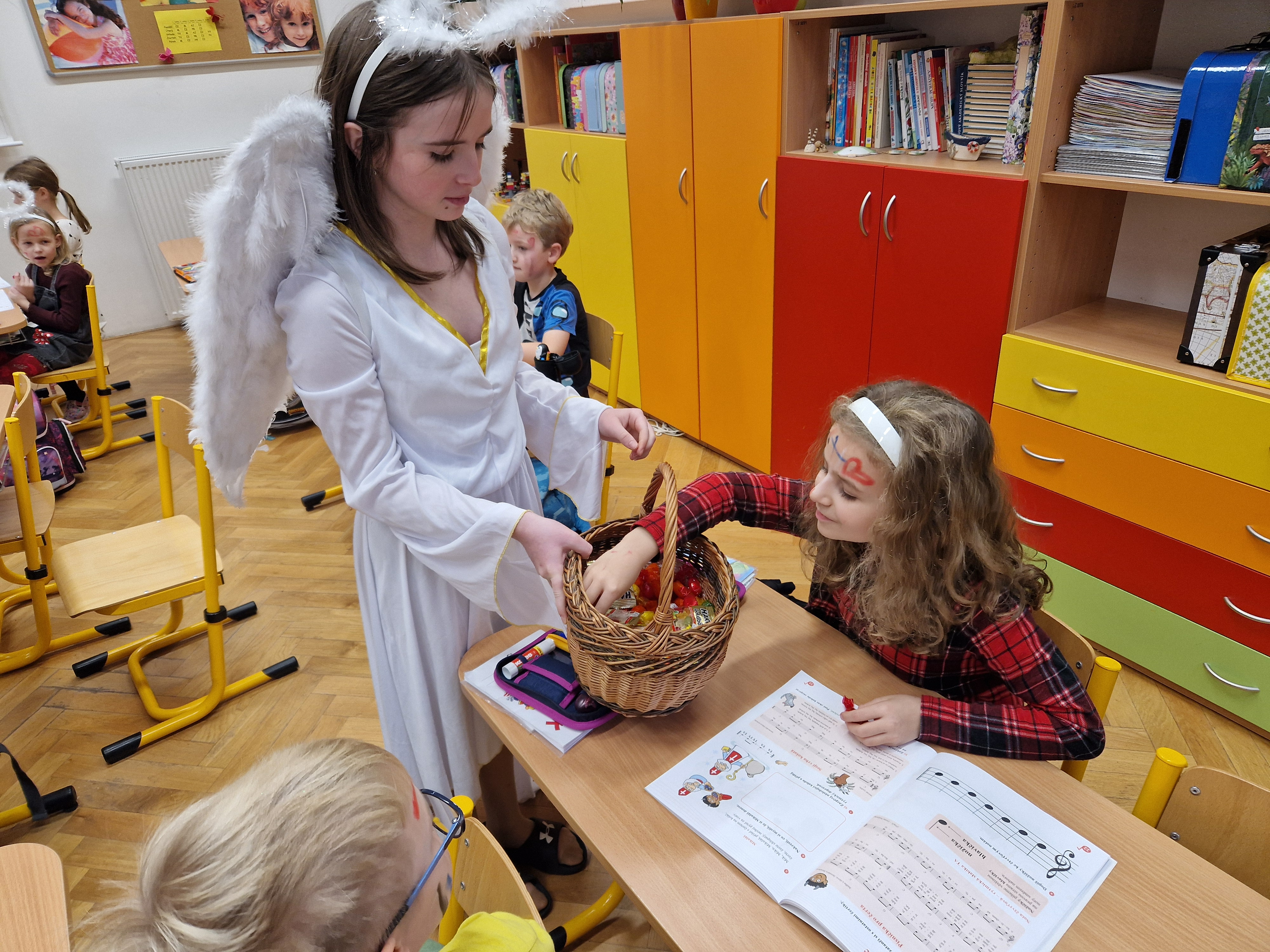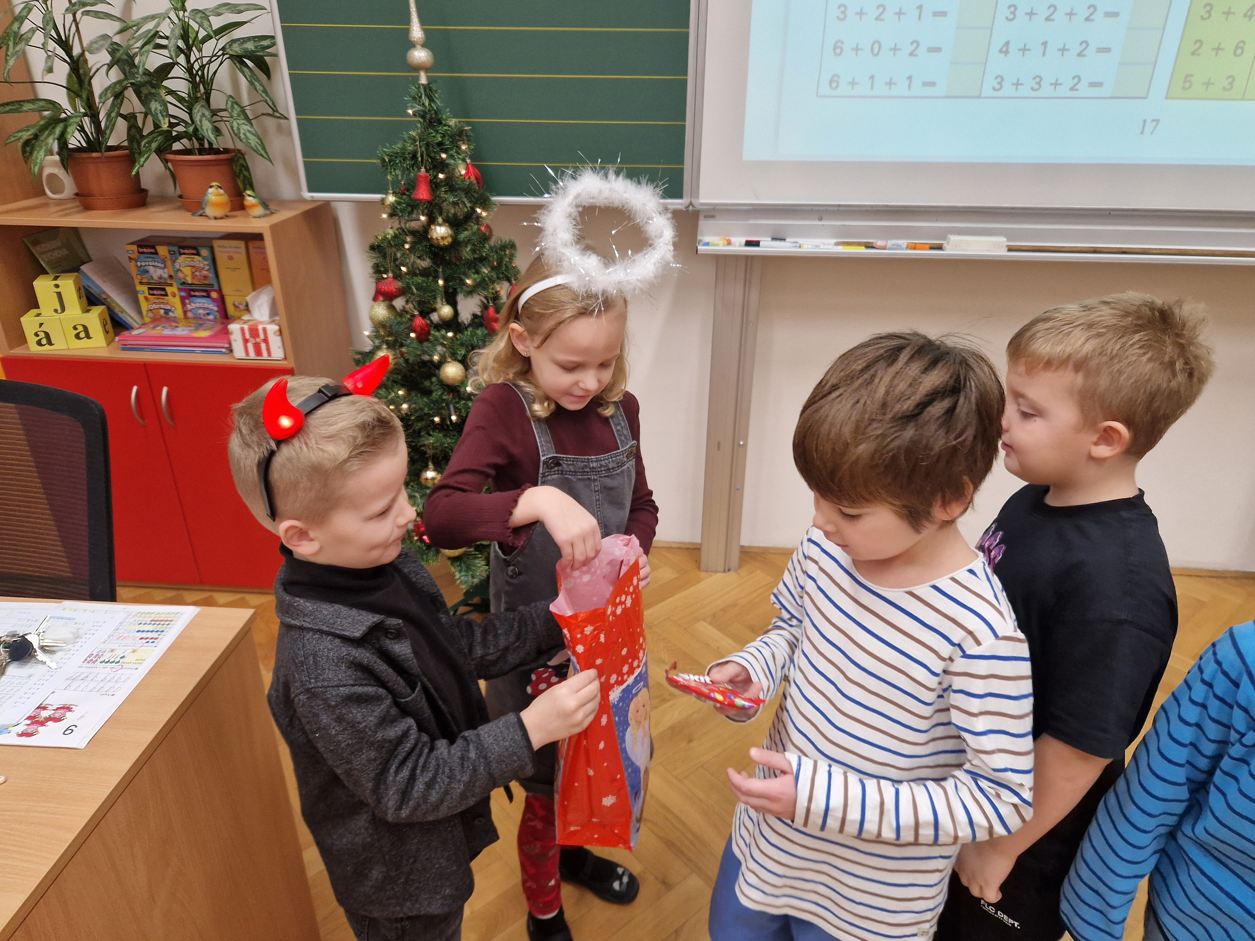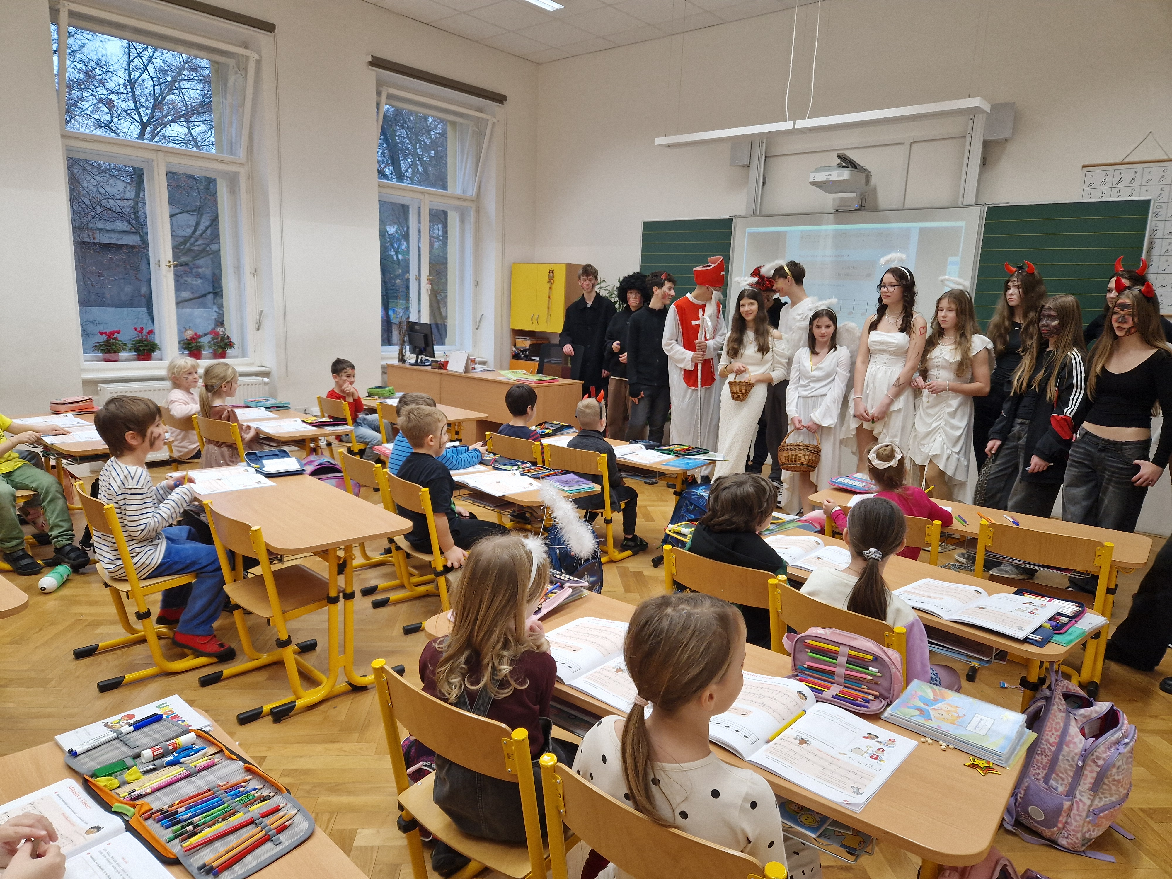Jakmile jsme zaslechli děsivý zvuk čertova řetězu na chodbě, běželi jsme se přikrčit do kouta třídy. Nejprve nás pozlobili čerti, kteří nám pomalovali obličeje. Potom už se slova ujal Mikuláš. Spolu s andílky se nás ptal, zda si plníme všechny své úkoly, chováme se dobře o přestávkách a hezky ke kamarádům. Za pěknou písničku a slib poslušnosti jsme dostali od andílků sladkou odměnu.