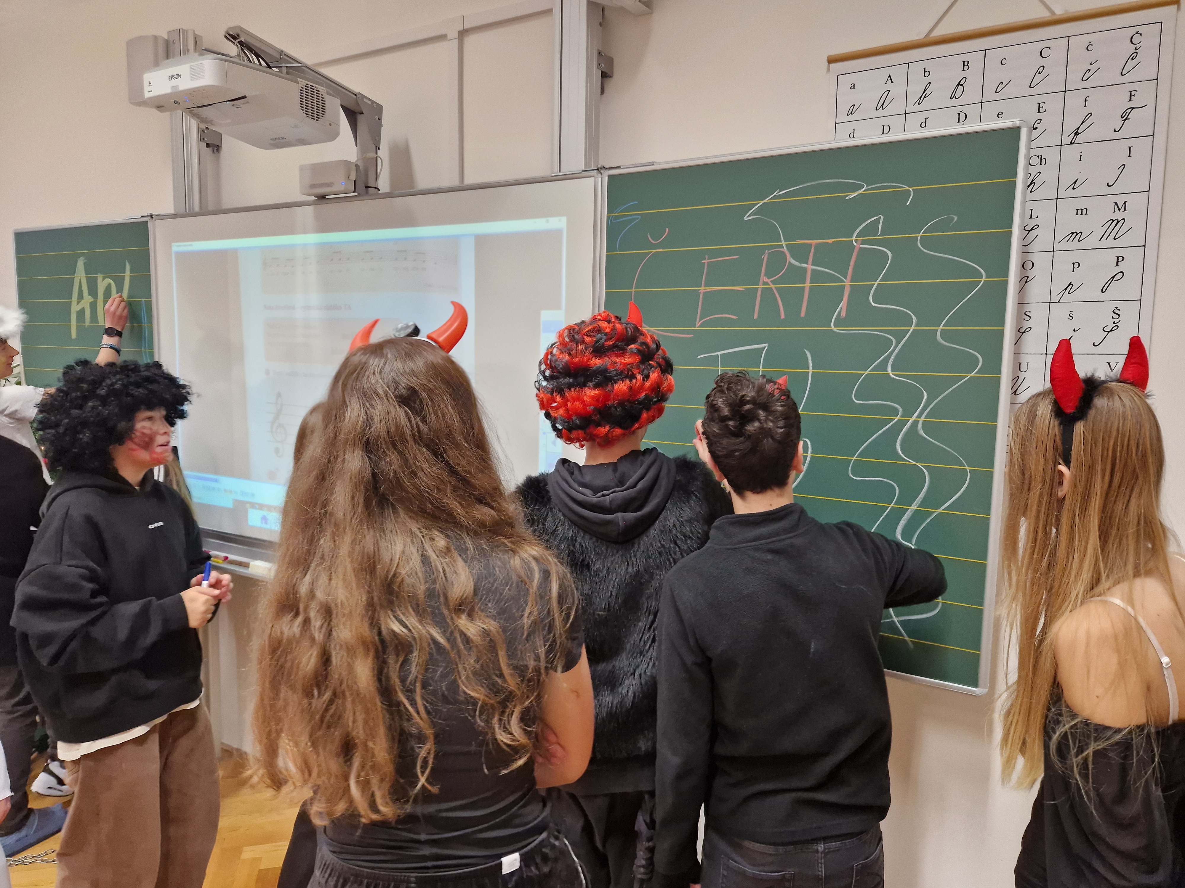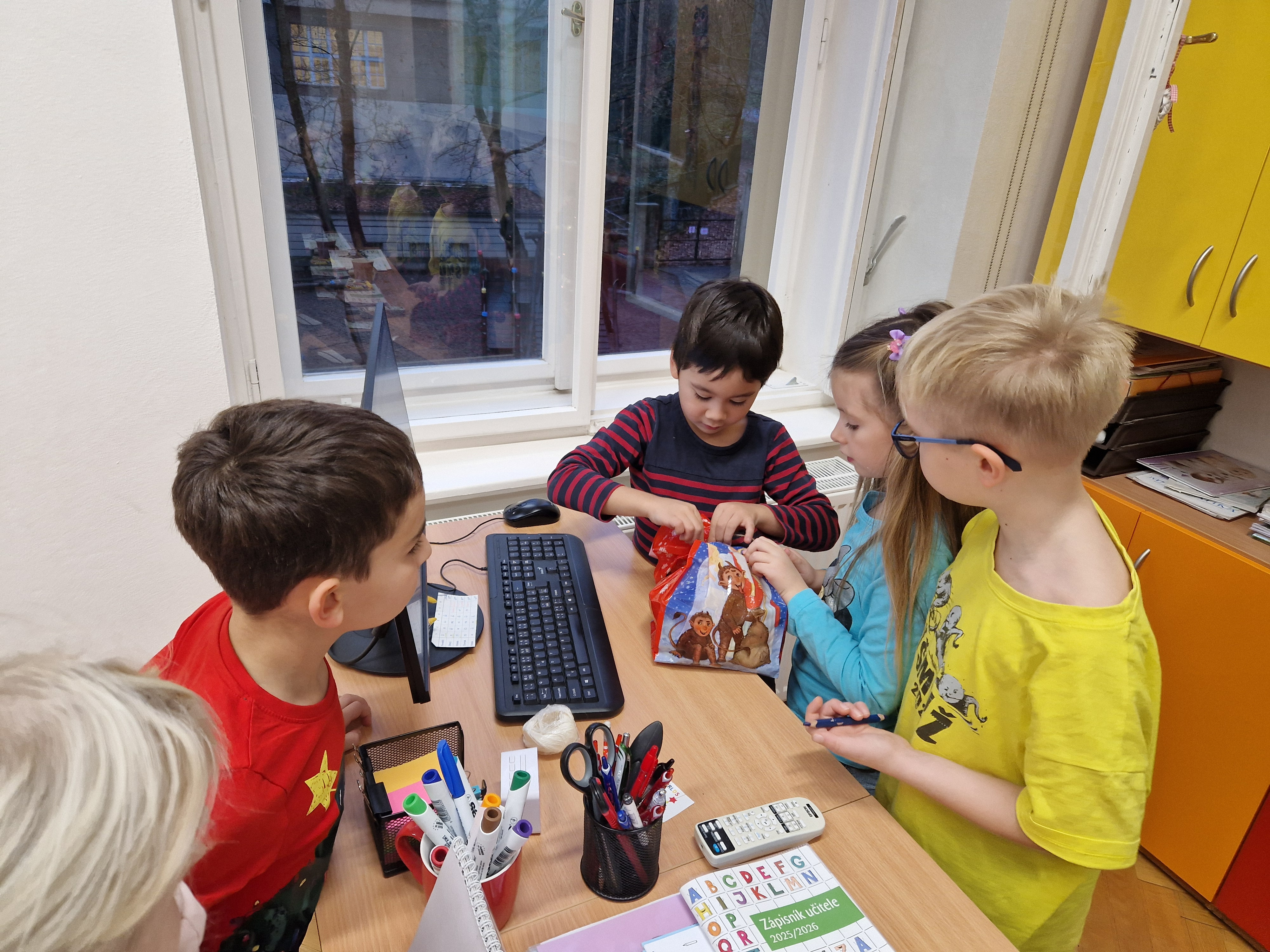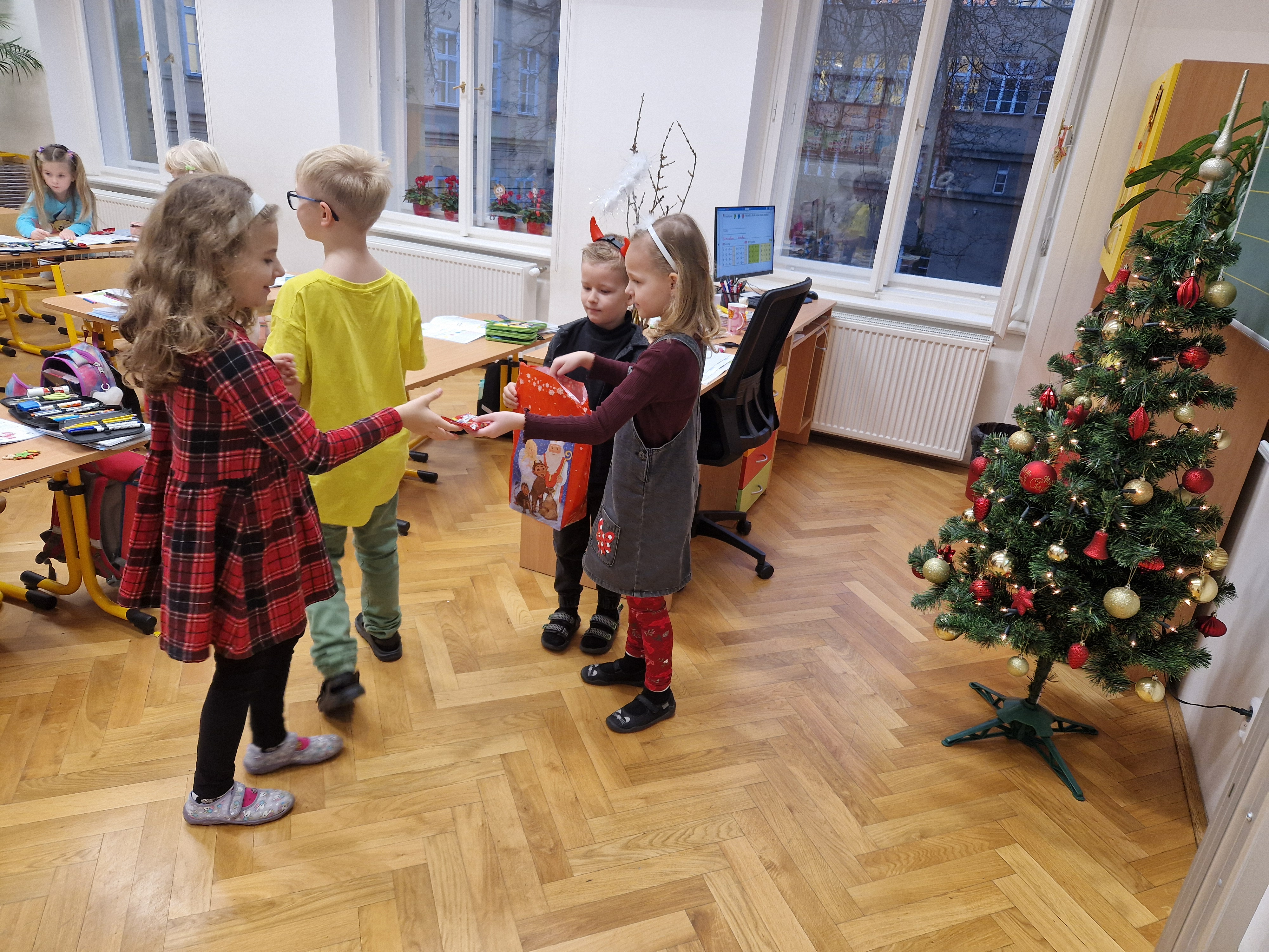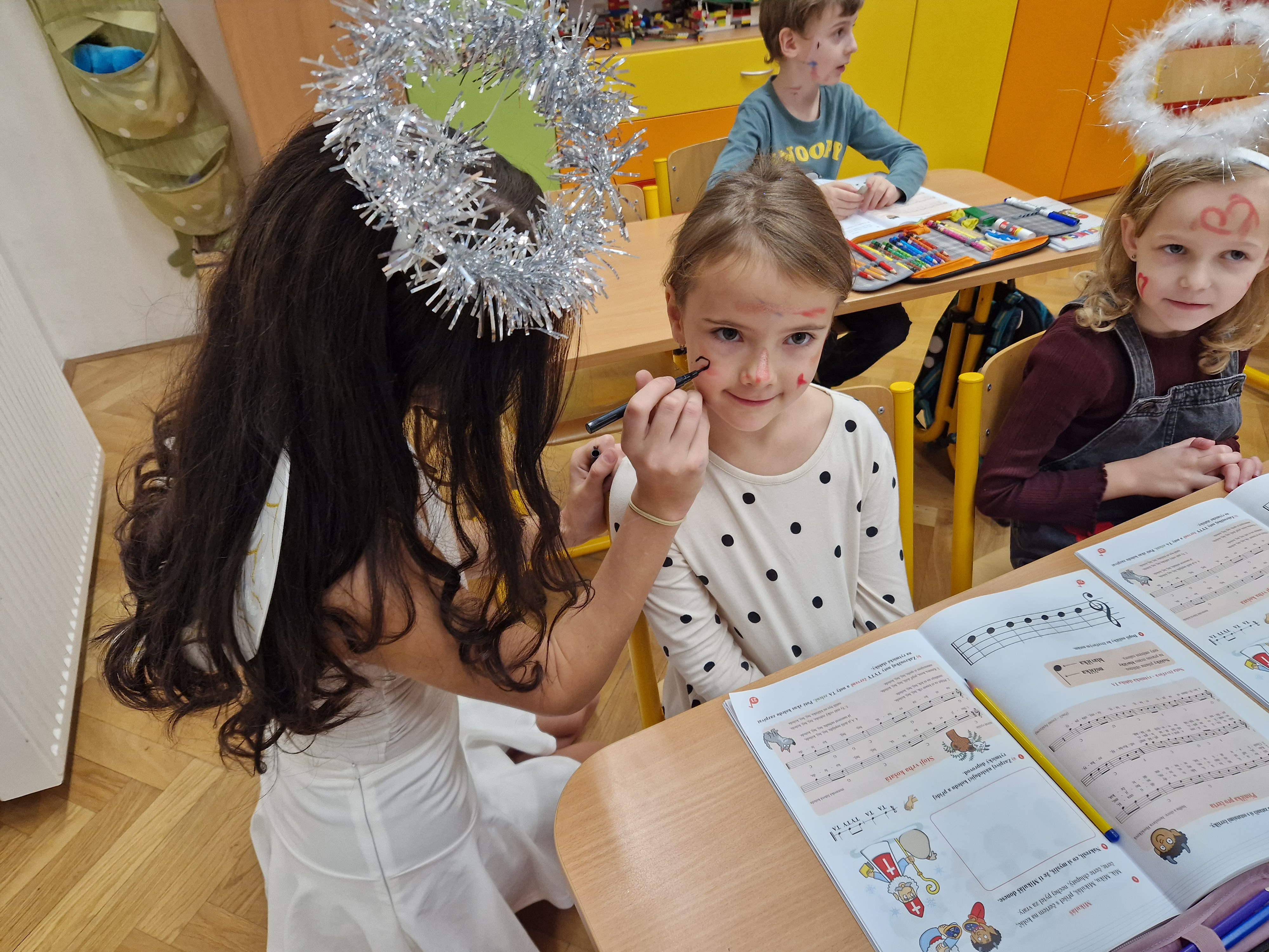 Jakmile jsme zaslechli děsivý zvuk čertova řetězu na chodbě, běželi jsme se přikrčit do kouta třídy. Nejprve nás pozlobili čerti, kteří nám pomalovali obličeje. Potom už se slova ujal Mikuláš. Spolu s andílky se nás ptal, zda si plníme všechny své úkoly, chováme se dobře o přestávkách a hezky ke kamarádům. Za pěknou písničku a slib poslušnosti jsme dostali od andílků sladkou odměnu.
