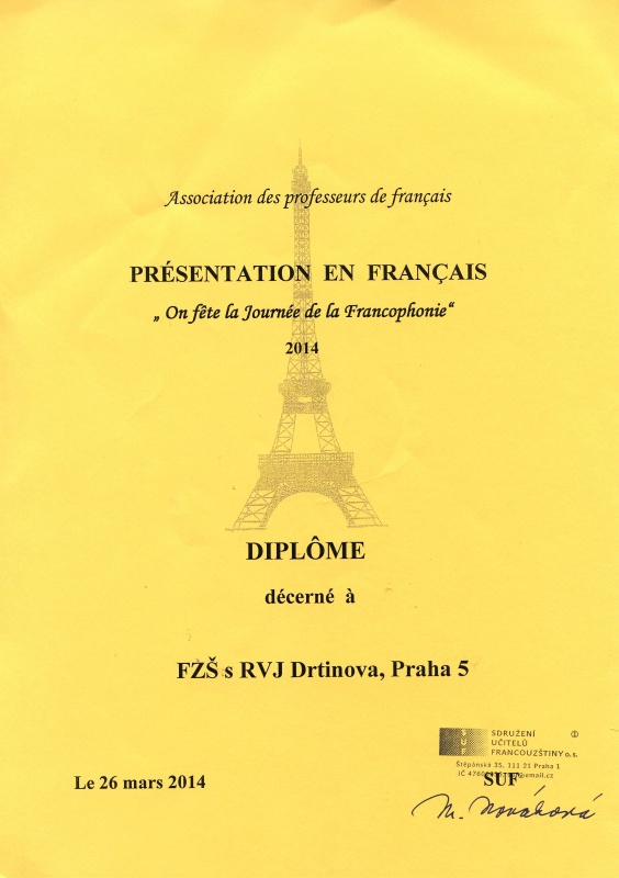 Třída 7. B přispěla krátkým vystoupením z románu Victora Huga Les Misérables k oslavě Dne frankofonie, která se konala 26. 3. 2014 v Národním technickém muzeu.