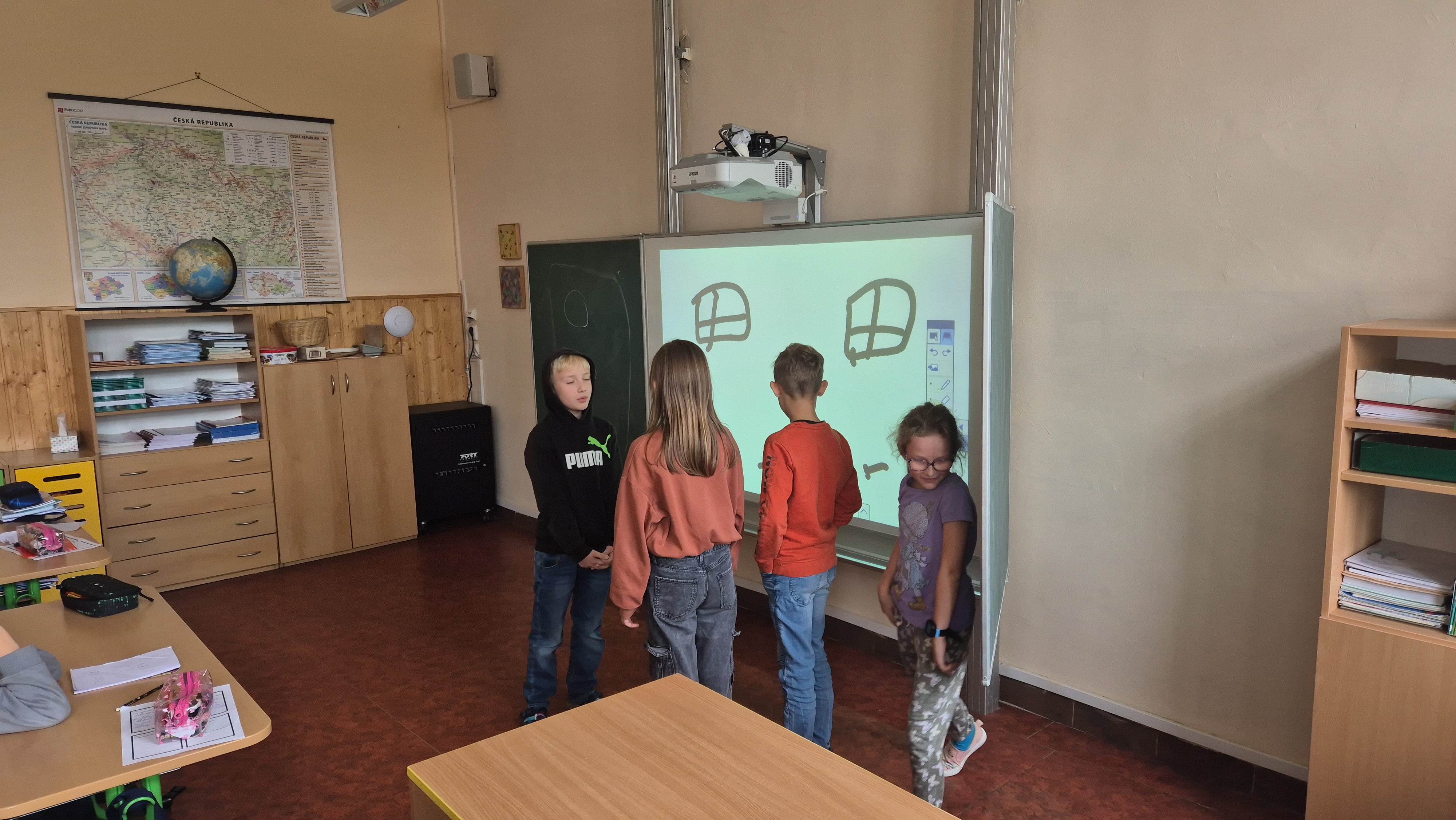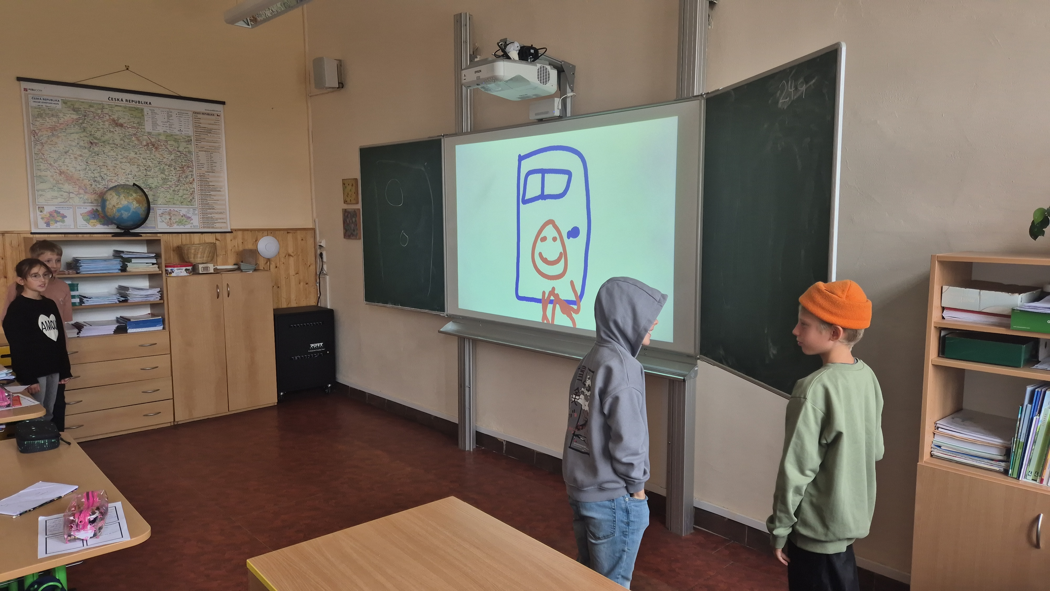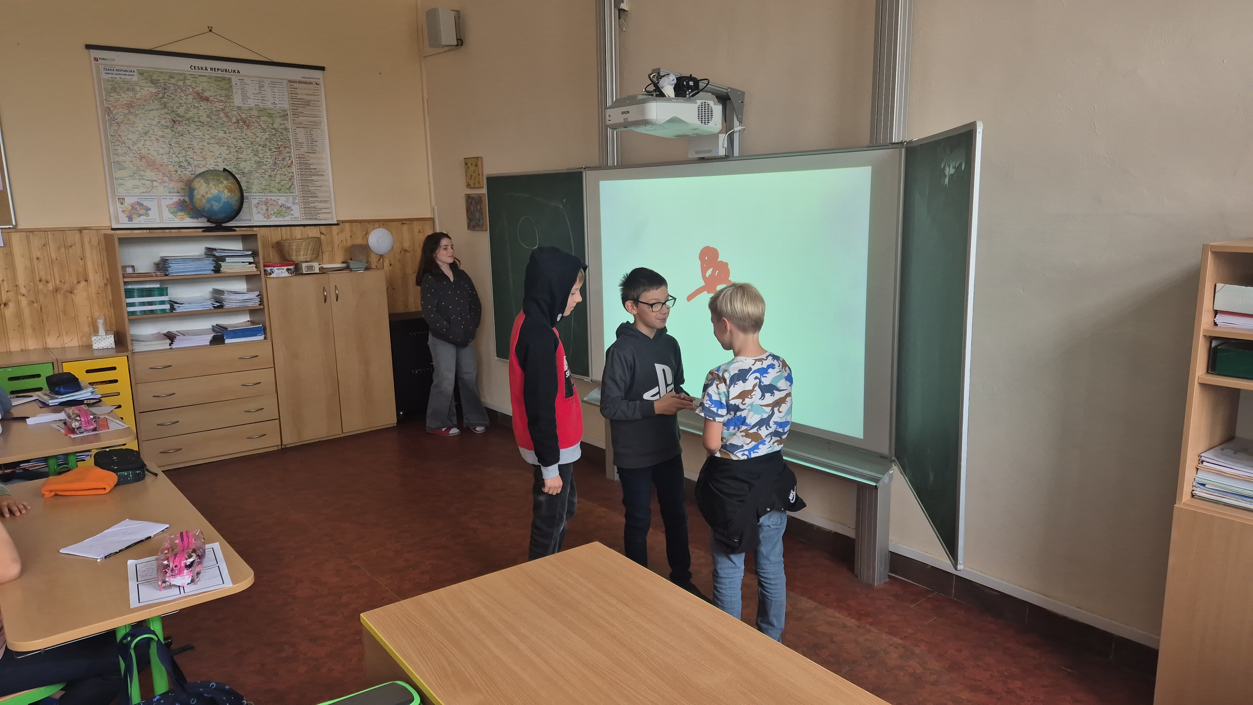 Ráno jsme vešli do třídy, ve které jsme se necítili vůbec dobře, a tak velmi brzy jsme si ji uklidili. Pracovali jsme s příběhem, vedli diskuzi a připravili ve skupinách scénky. Lehce jsme se dotkli i tvorby graffiti.