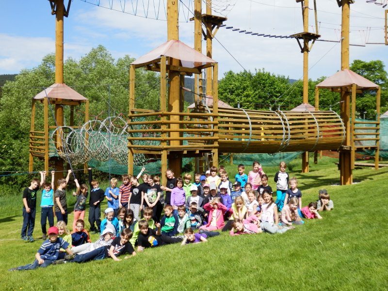Kromě her v přírodě a na hřišti jsme si vyzkoušeli svou obratnost v lanovém centru v Železné Rudě. Vyslechli jsme si přednášku Horské služby Špičák a vystoupali na rozhlednu Pancíř, kde jsme se kochali krásnými panoramaty. Obdivovali jsme i skřítky na Pohádkové stezce a v Pohádkové zahradě Brčálník. Nechyběla ani přednáška tří třeťaček o první pomoci, zpívání prvňáčků, karneval a opékání buřtů. V Železné Rudě jsme si mohli nakoupit pozornosti a zhlédnout výstavu skřítků. Několikrát jsme se projeli i vláčkem.