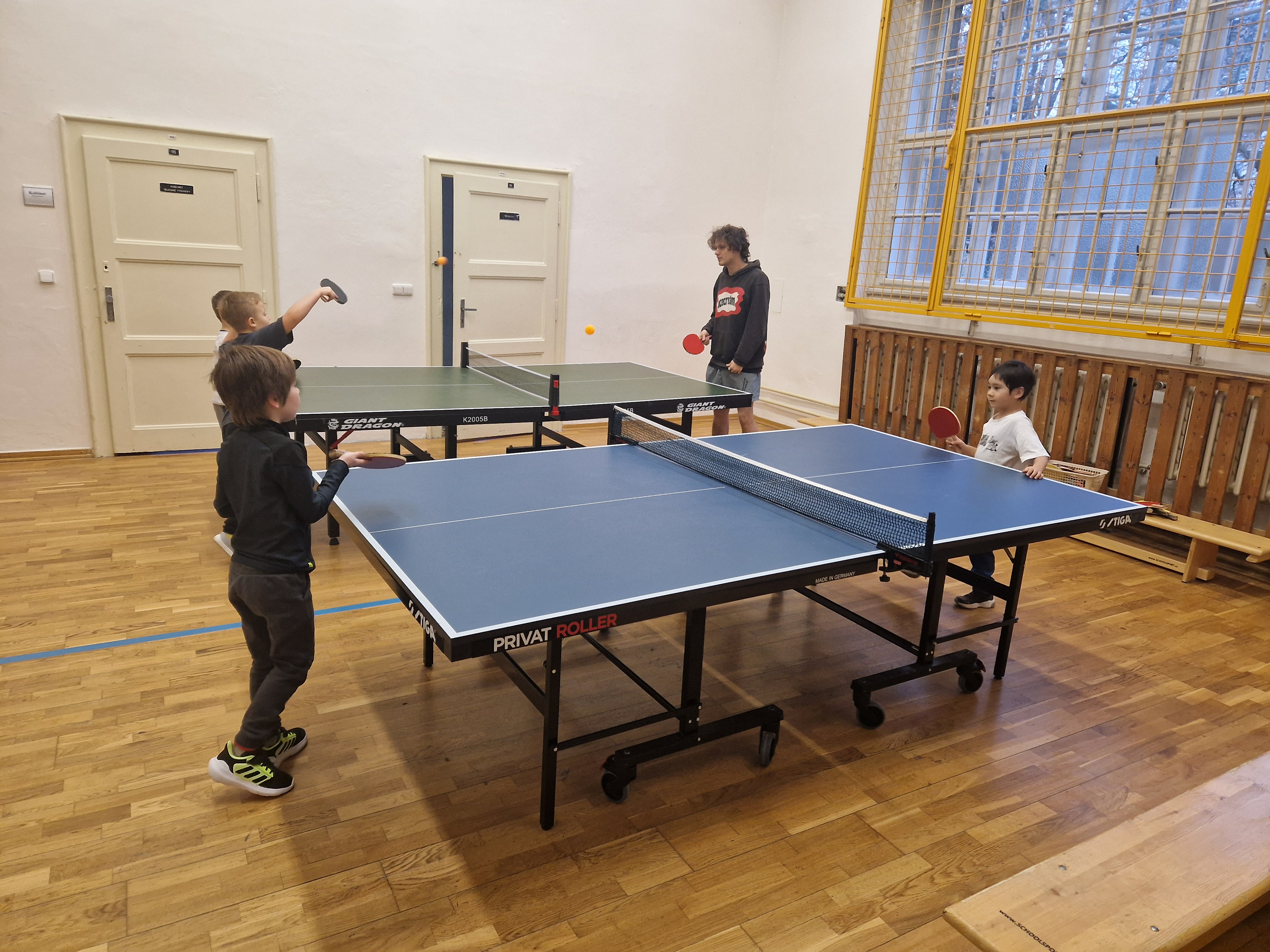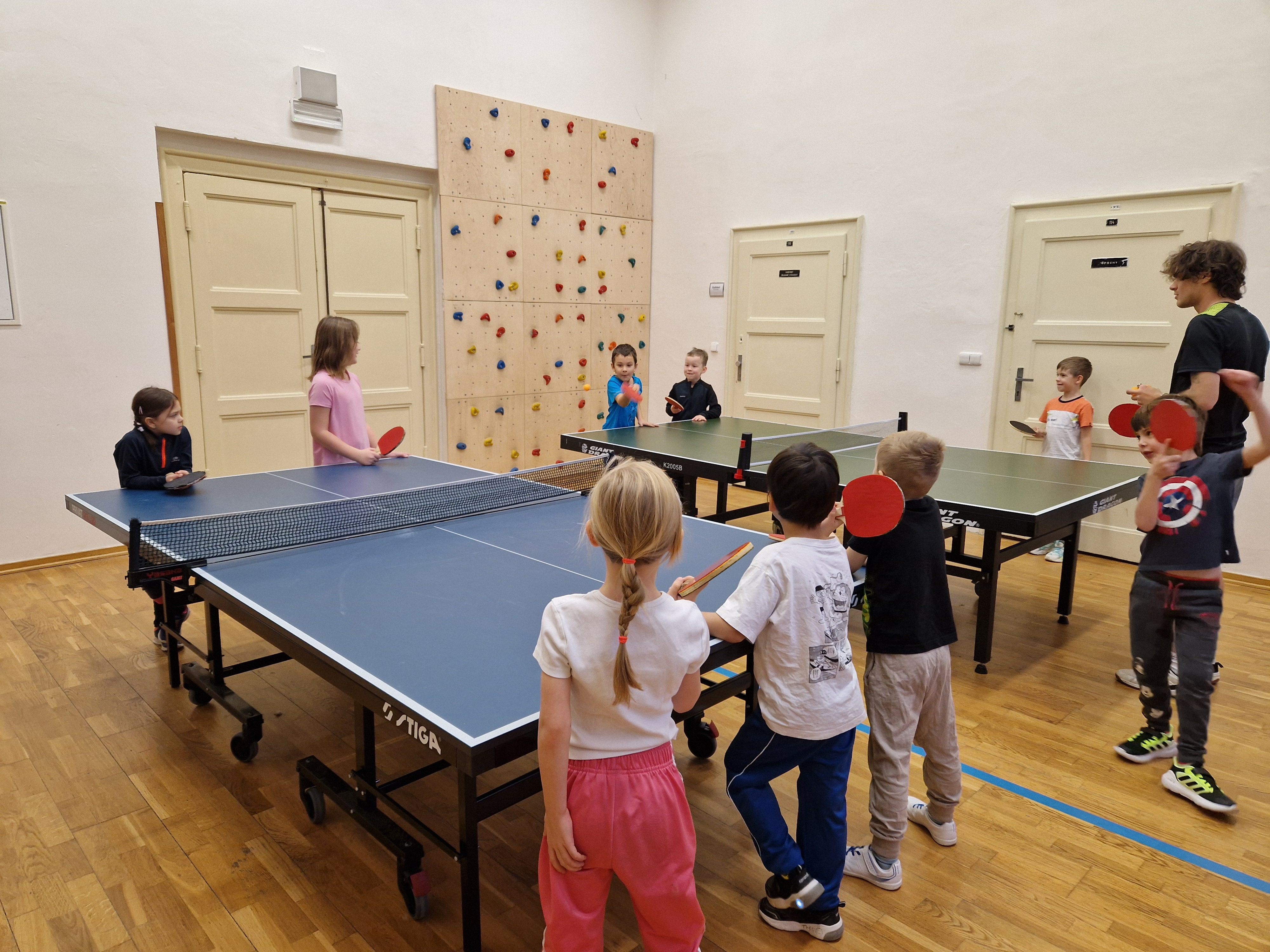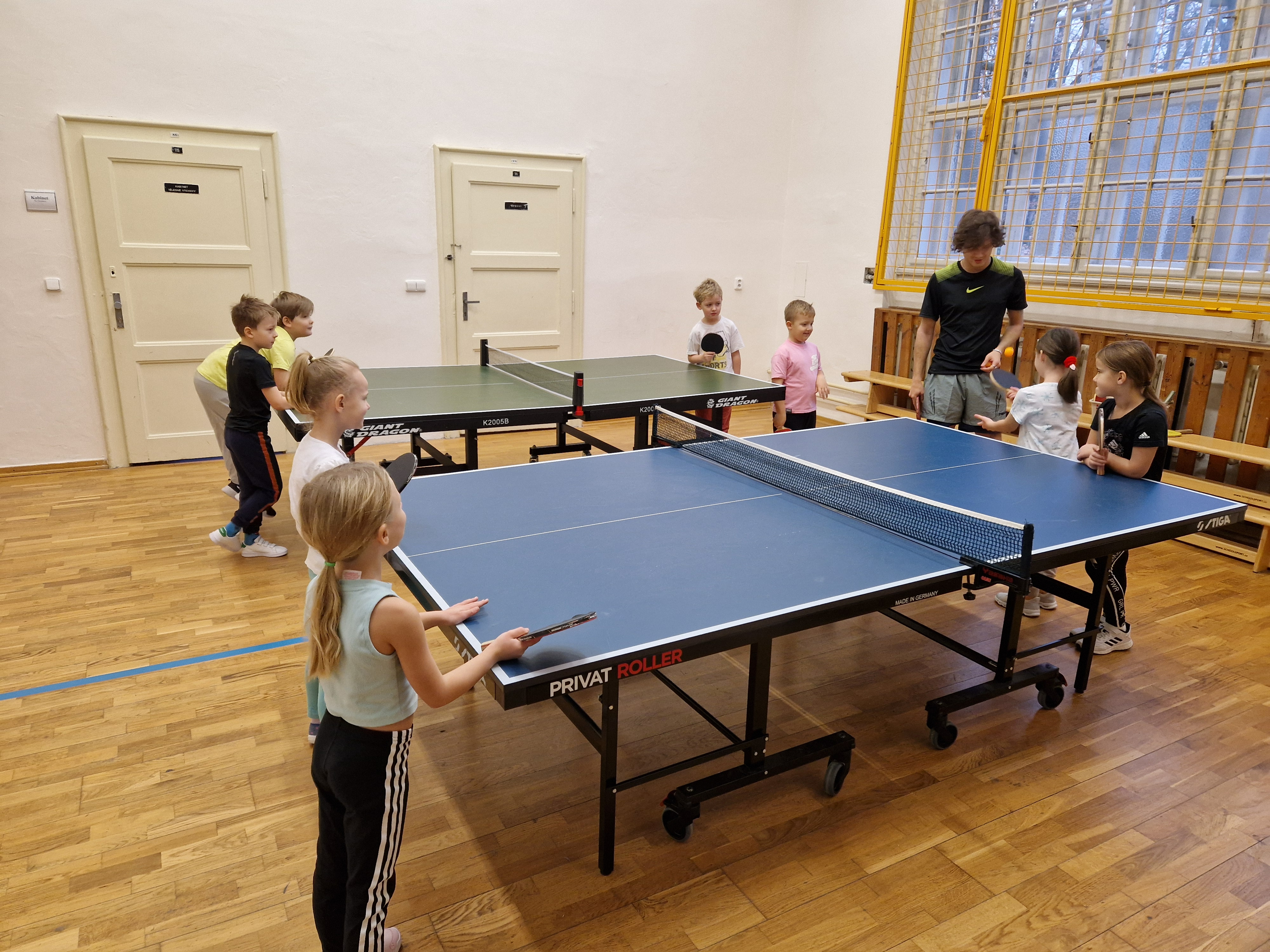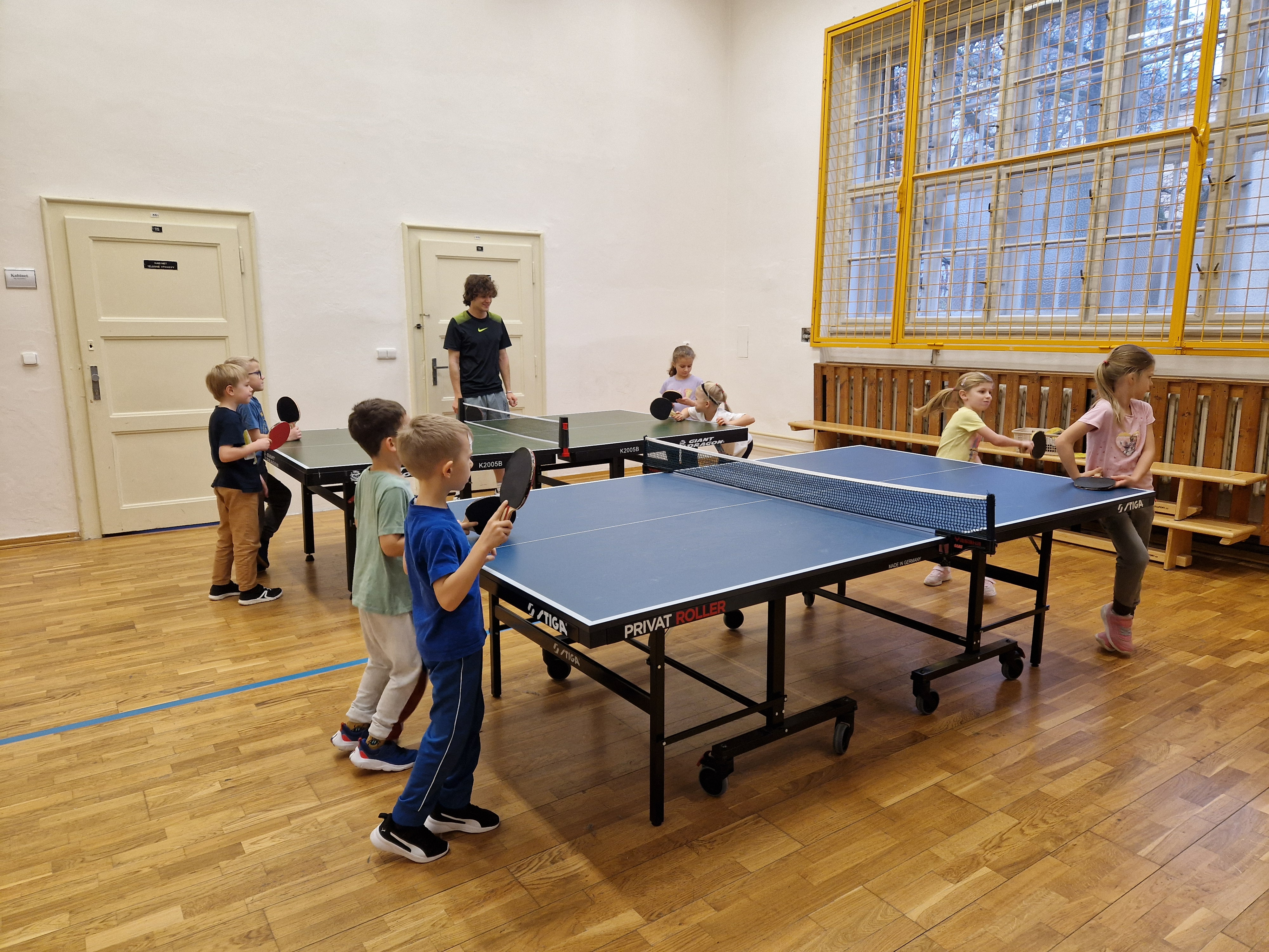 Při středeční hodině tělocviku jsme se sešli s kamarády z 1. A ke společnému cvičení. Byli jsme plní energie a těšili jsme se na program. Po krátké rozcvičce jsme se rozdělili do týmů. Při soutěživých hrách tělocvičnu naplnilo naše obrovské povzbuzování. Zaujala nás i lekce stolního tenisu. Přestože někteří z nás drželi pálku úplně poprvé, byla to zábava. Závěrečná „mezitřídní“ hra skončila nerozhodným výsledkem. Odcházeli jsme tedy lehce udýchaní, ale hodně spokojení.