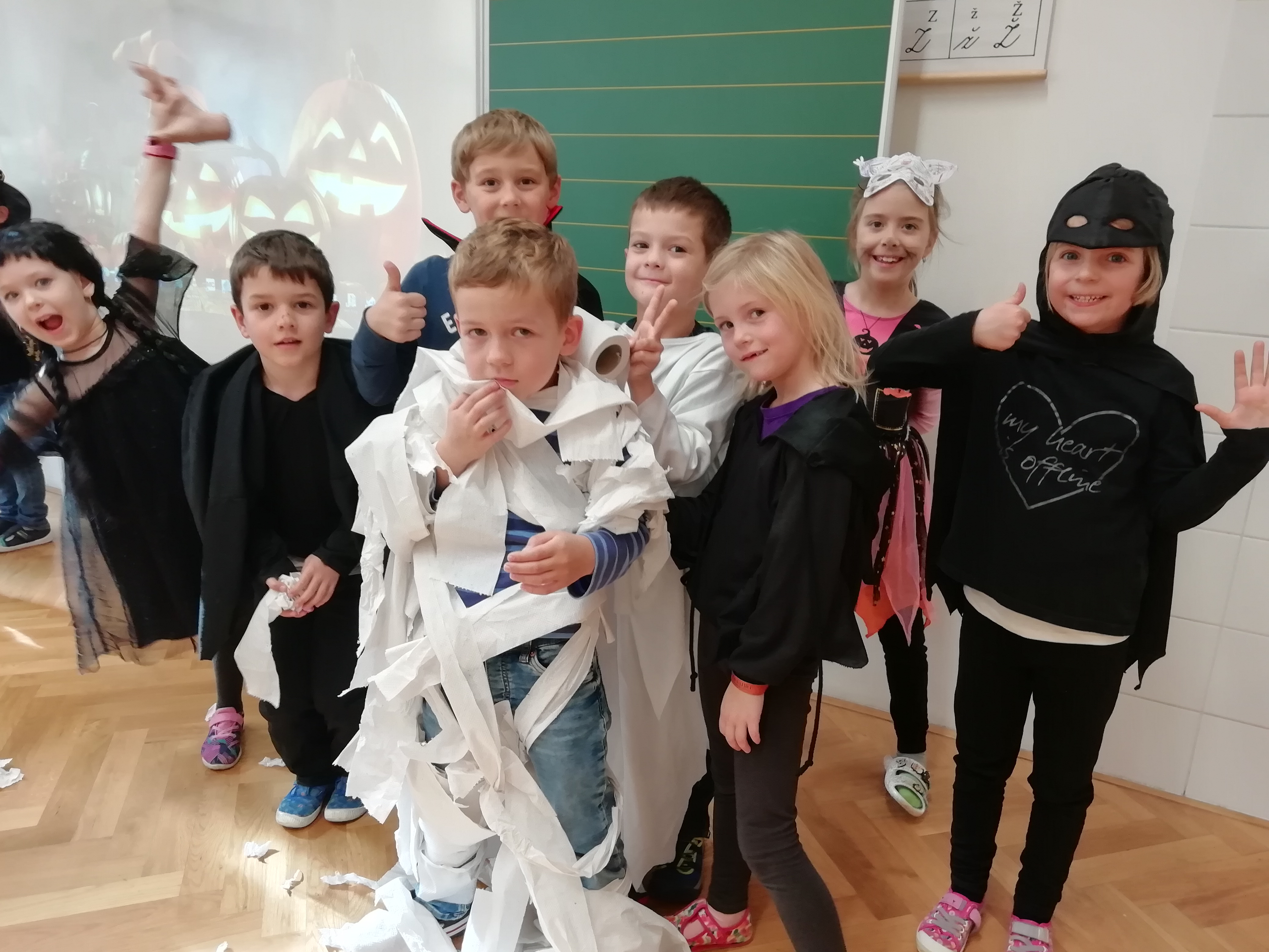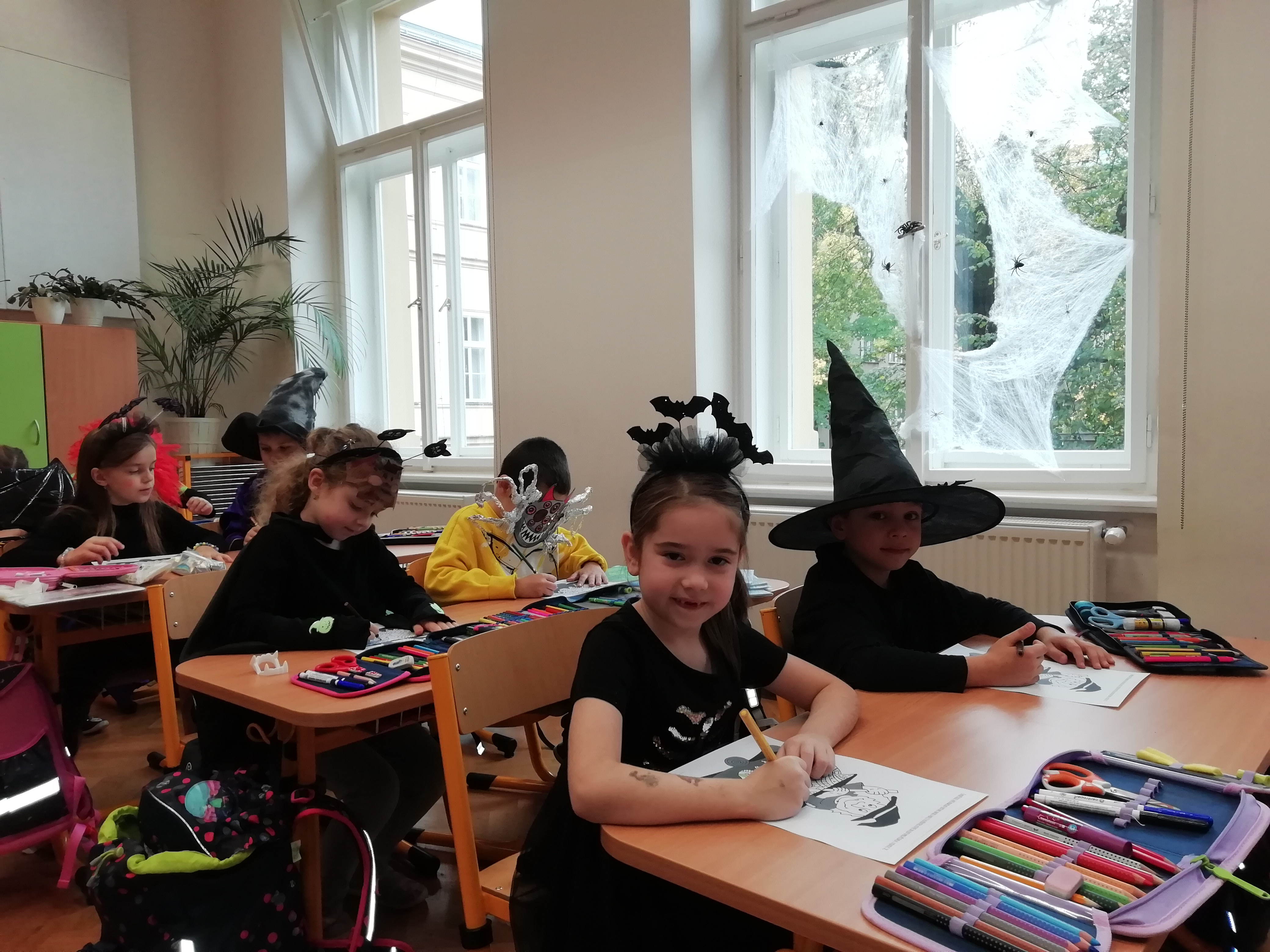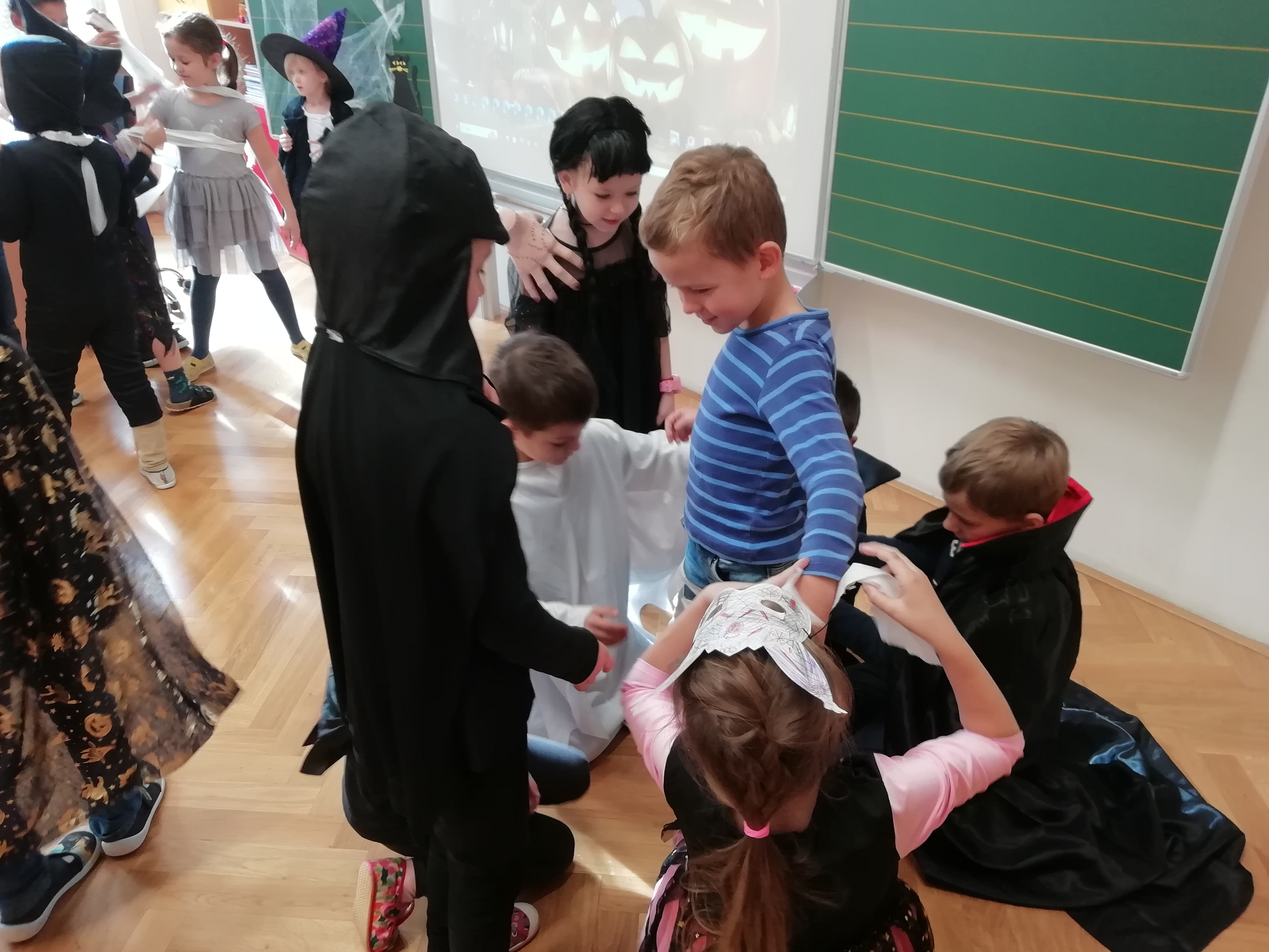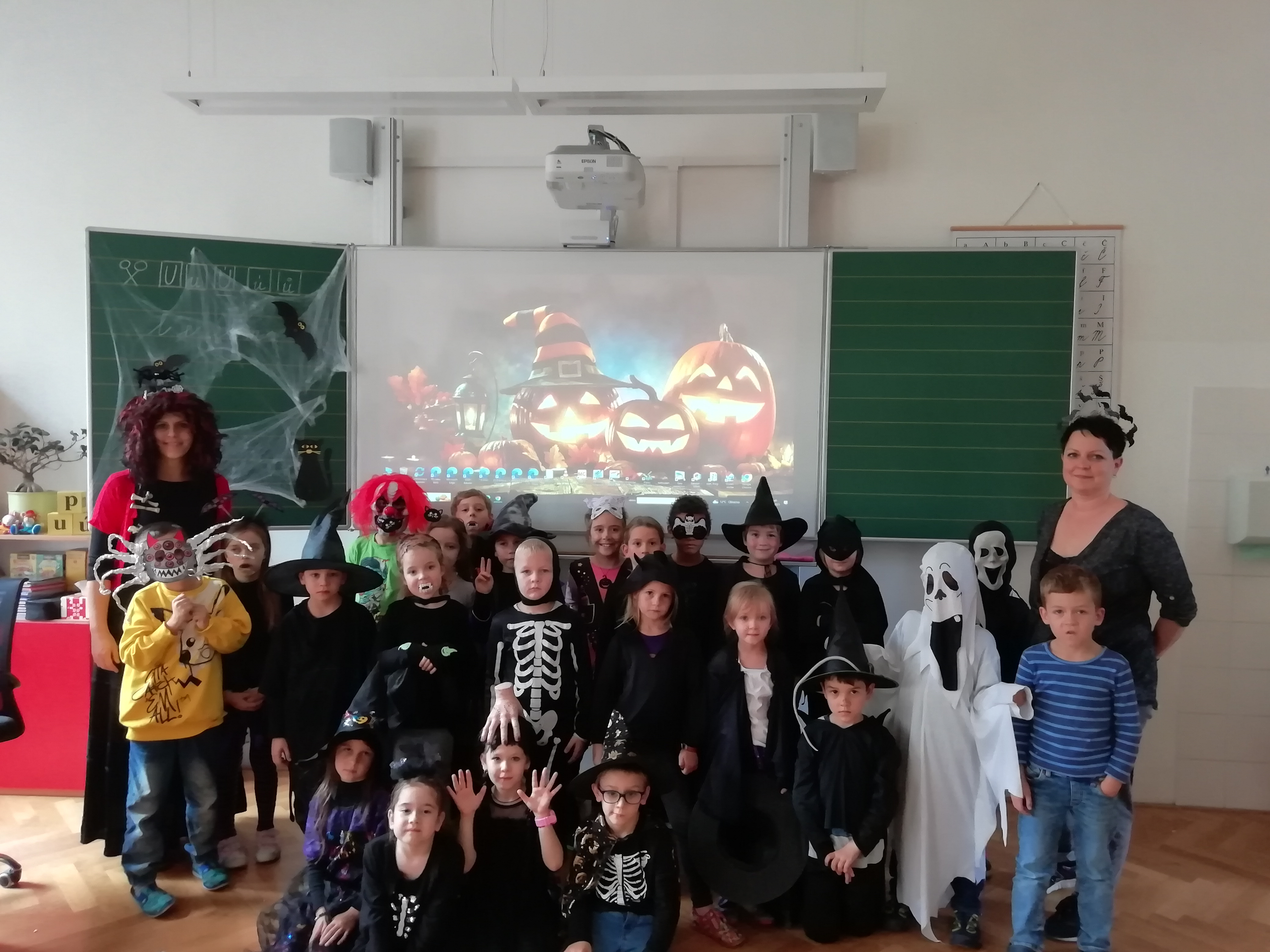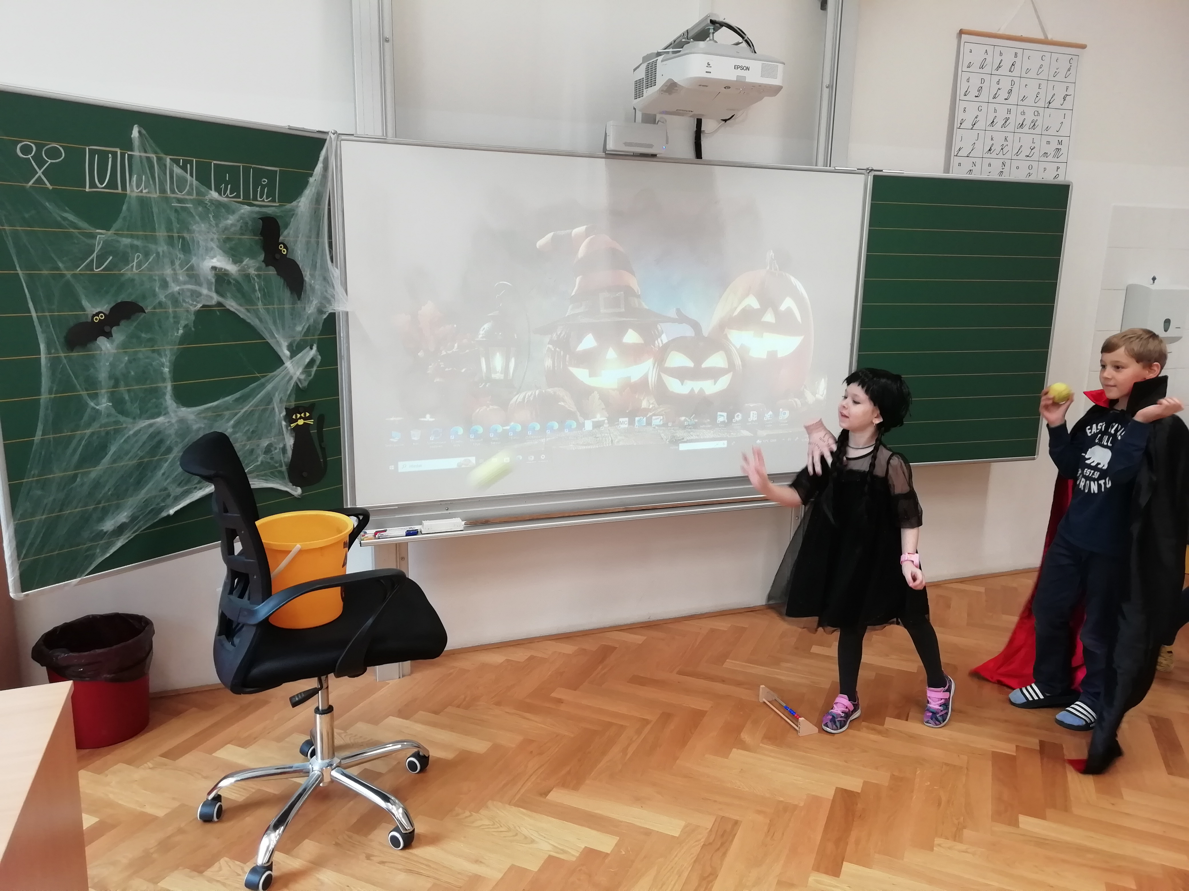 ...dnes jsme se proměnili ve strašidelnou třídu. Místo vzorných prvňáčků seděli v lavicích duchové, čarodějnice a čarodějové, upíři, černé kočky a jiná stvoření. Společné halloweenské hry se nám moc líbily a budeme se těšit na další podobnou akci.