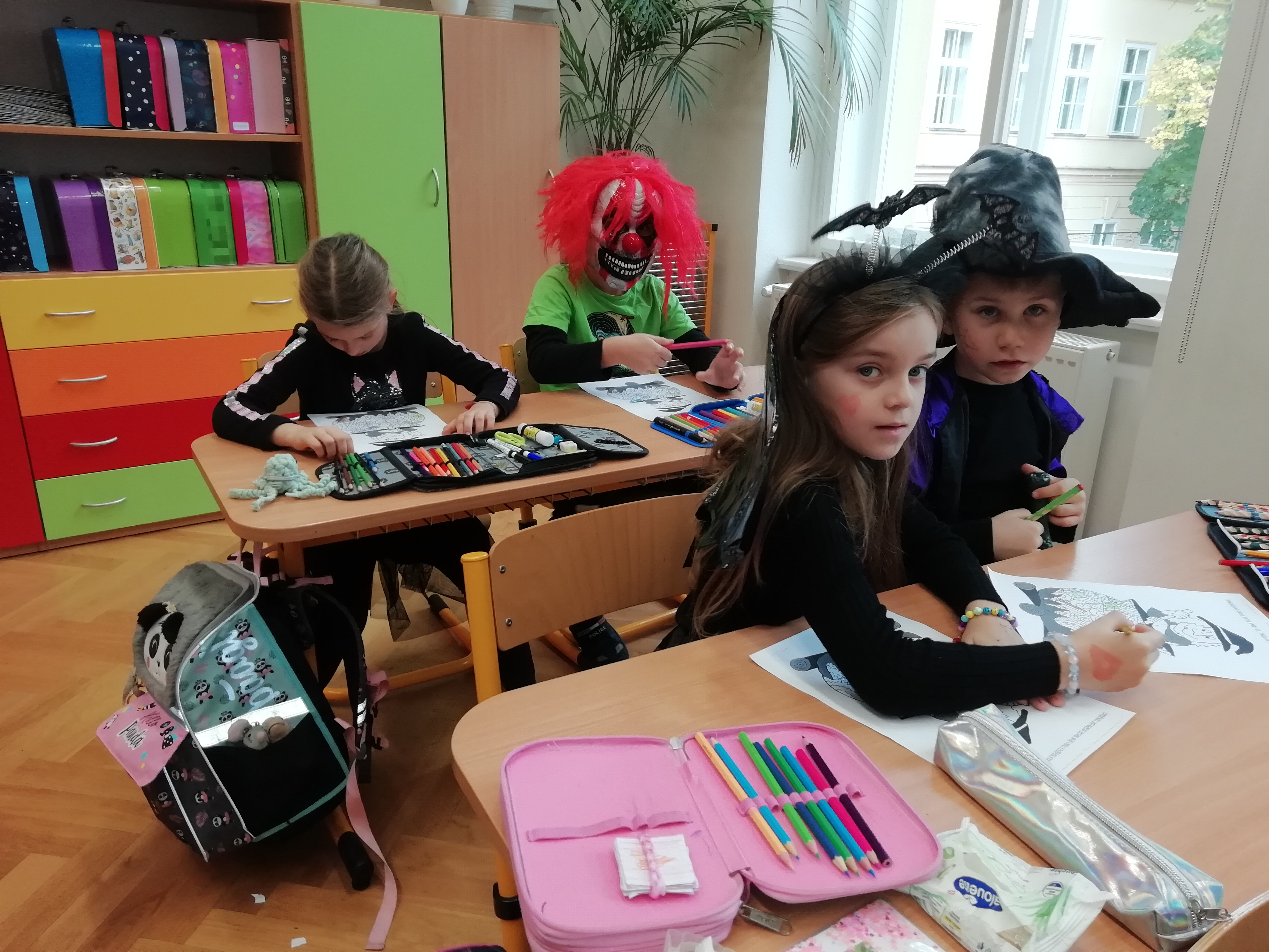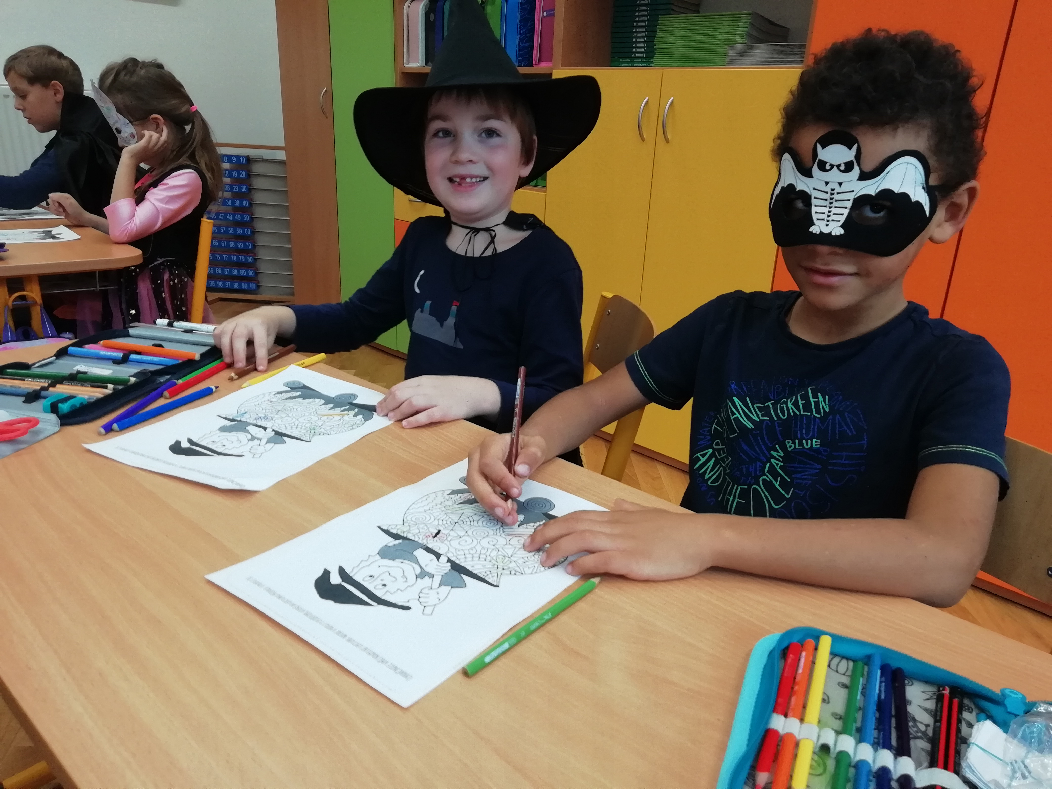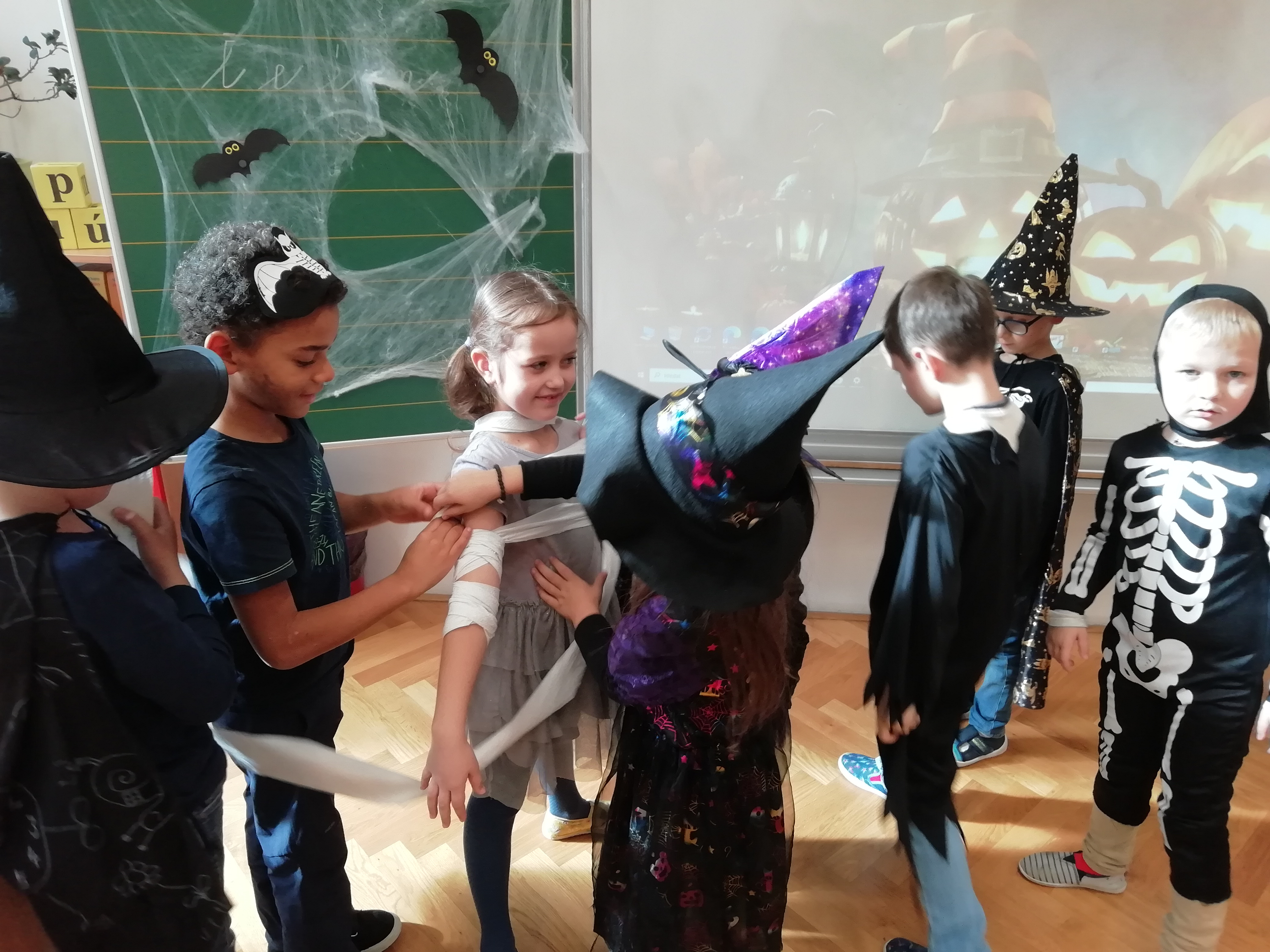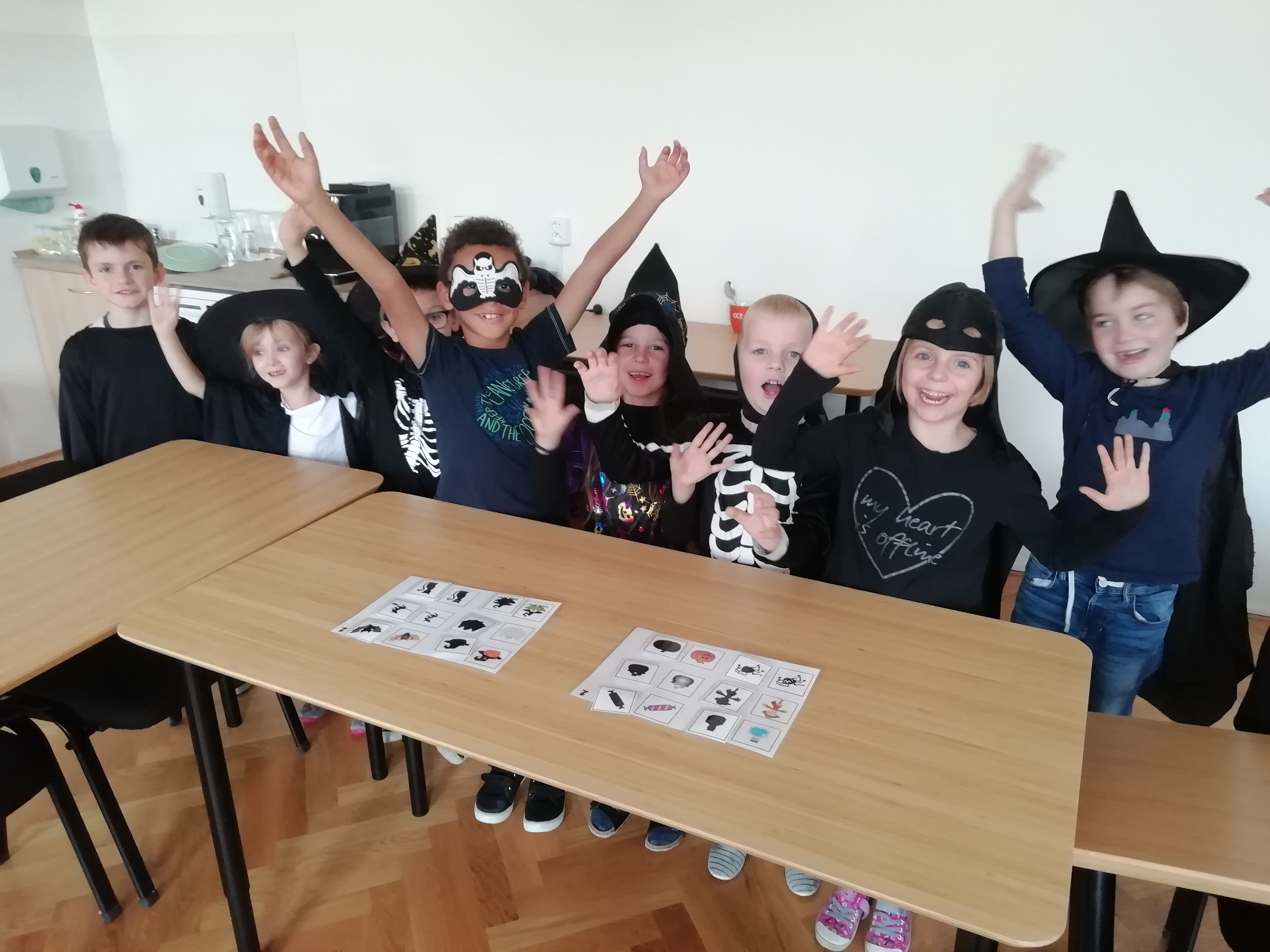 ...dnes jsme se proměnili ve strašidelnou třídu. Místo vzorných prvňáčků seděli v lavicích duchové, čarodějnice a čarodějové, upíři, černé kočky a jiná stvoření. Společné halloweenské hry se nám moc líbily a budeme se těšit na další podobnou akci.