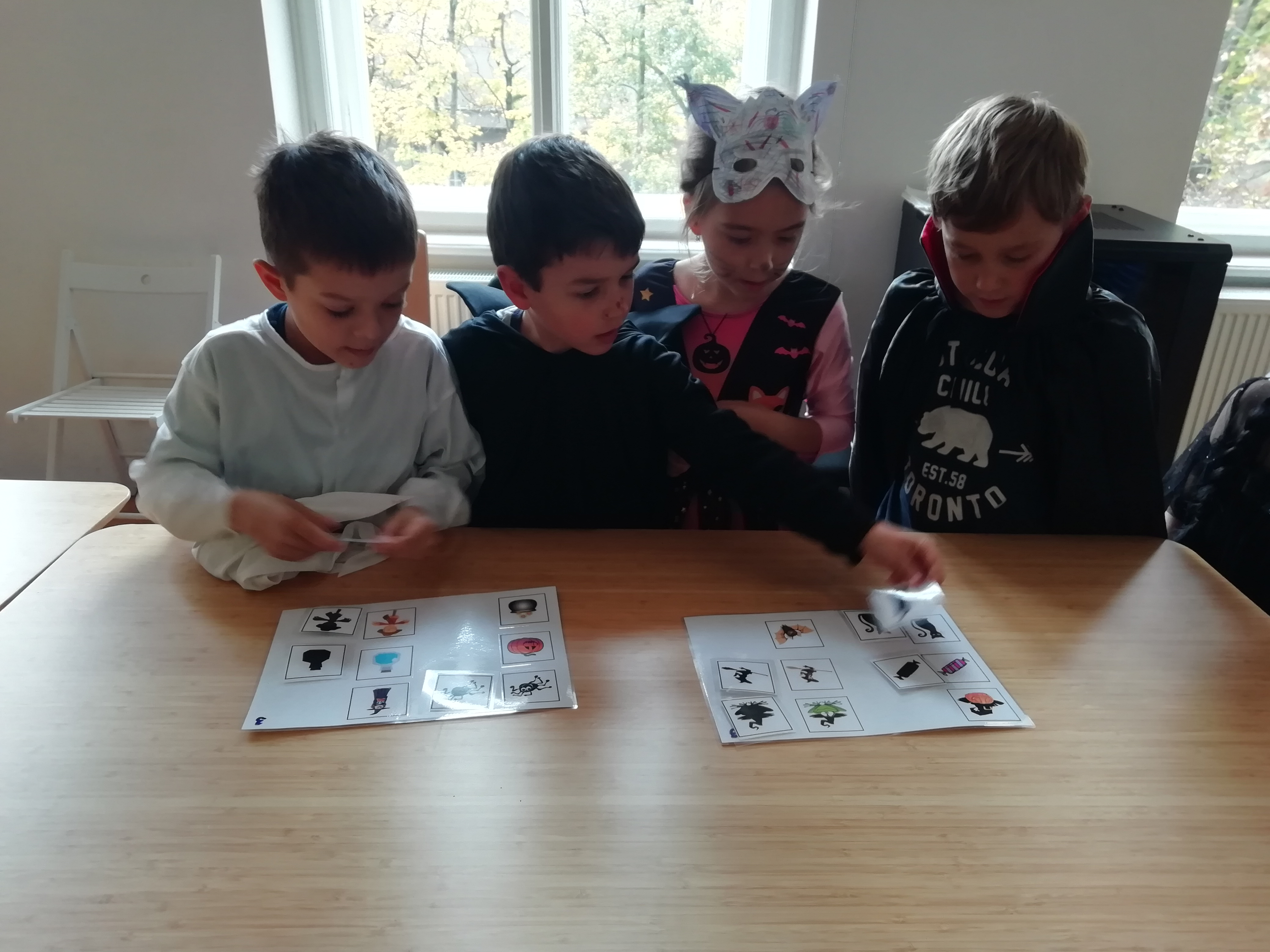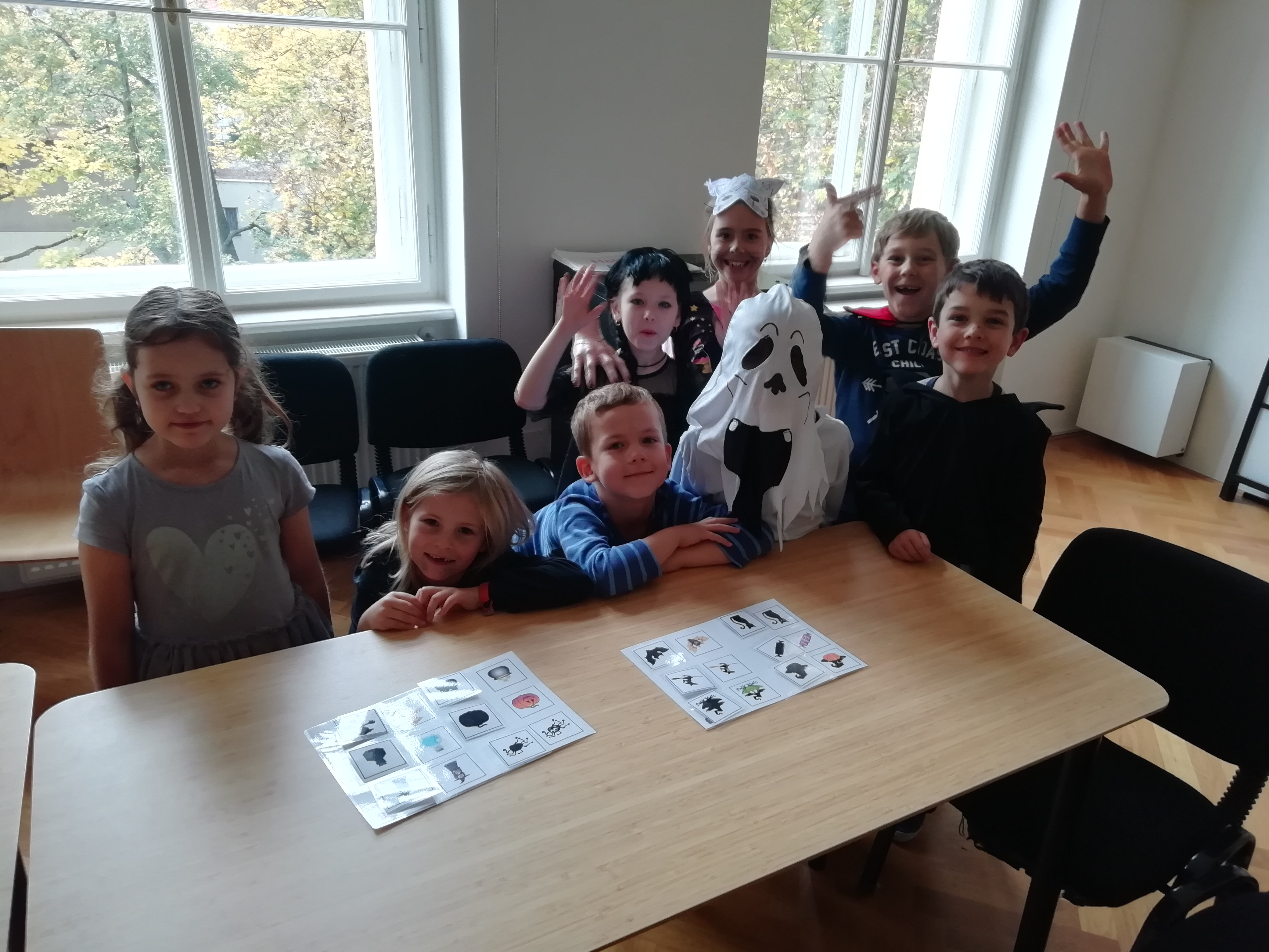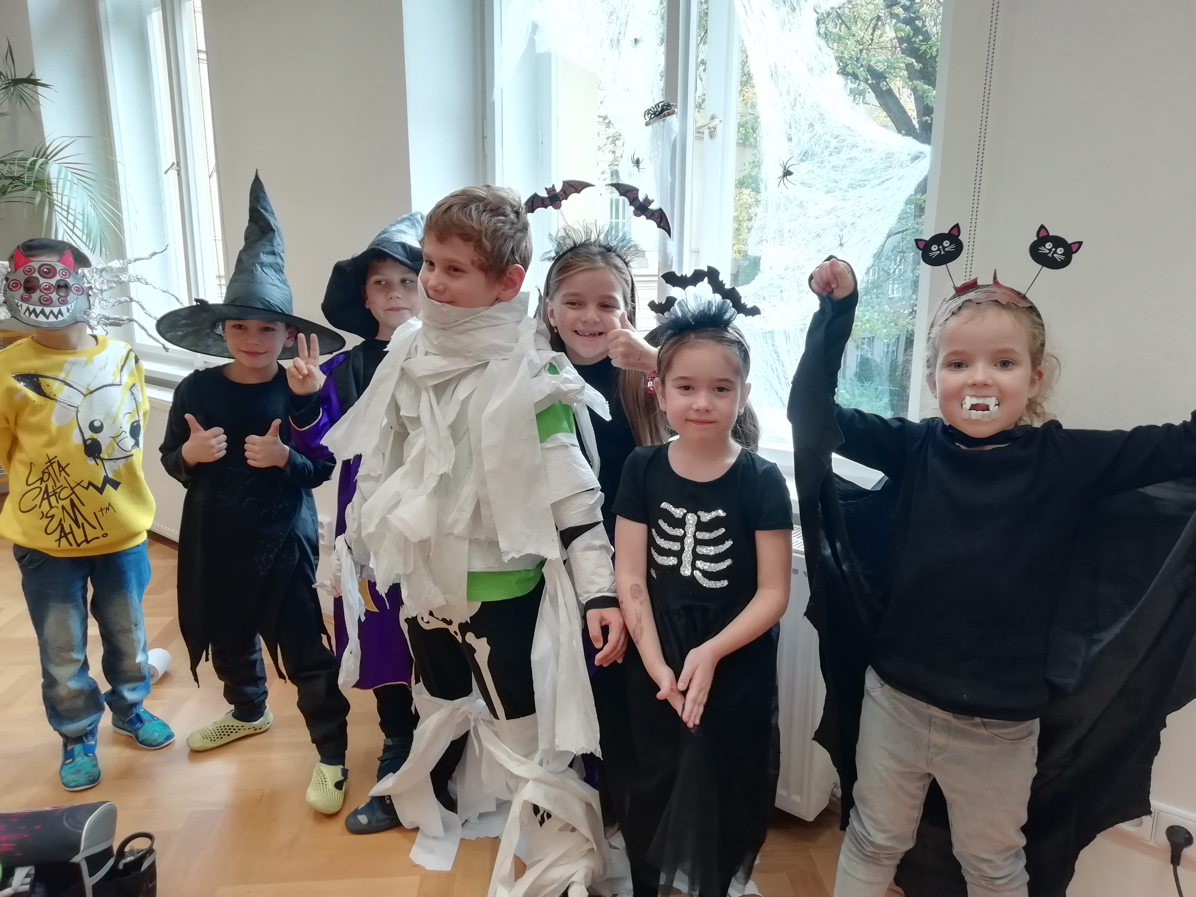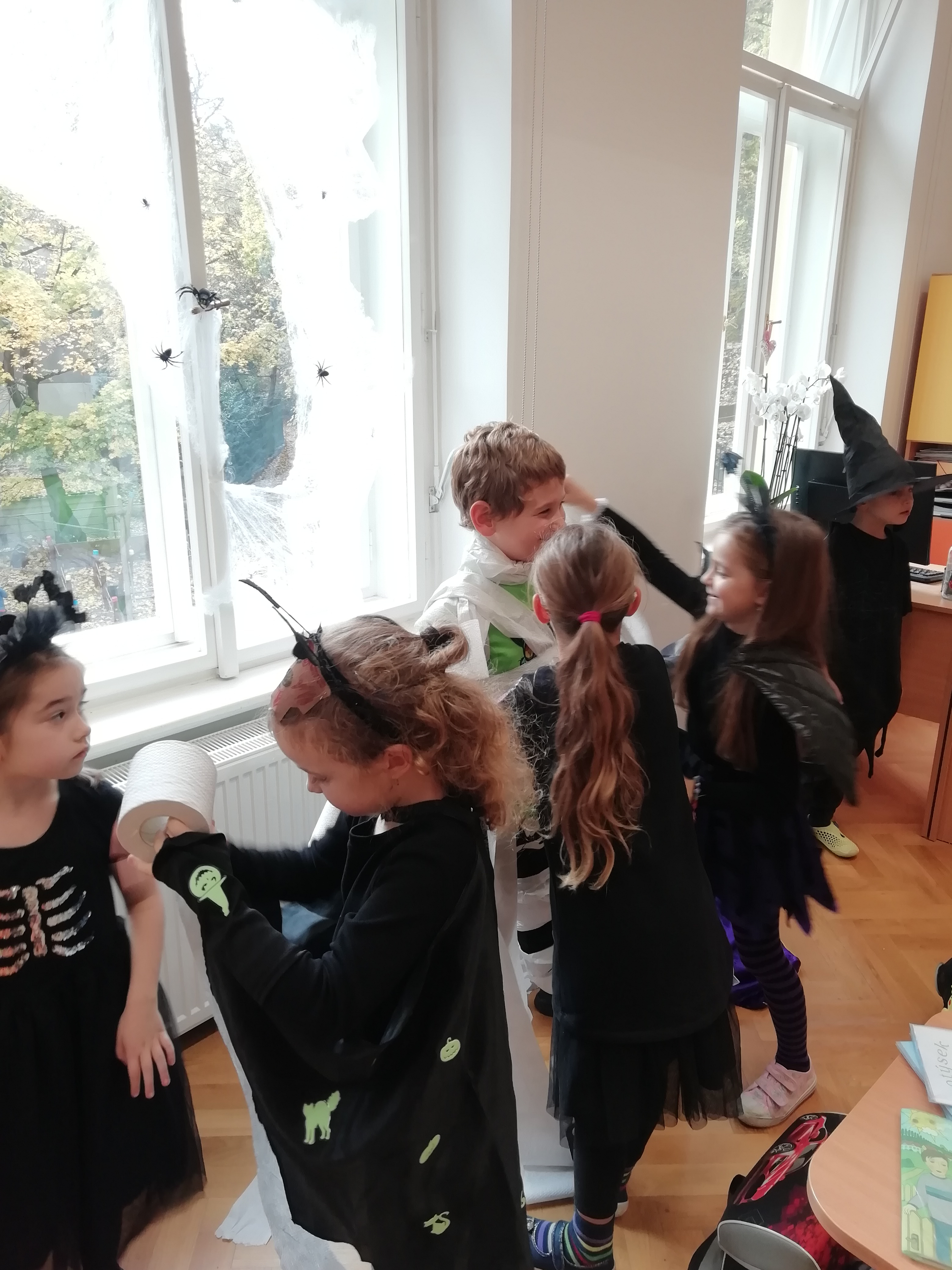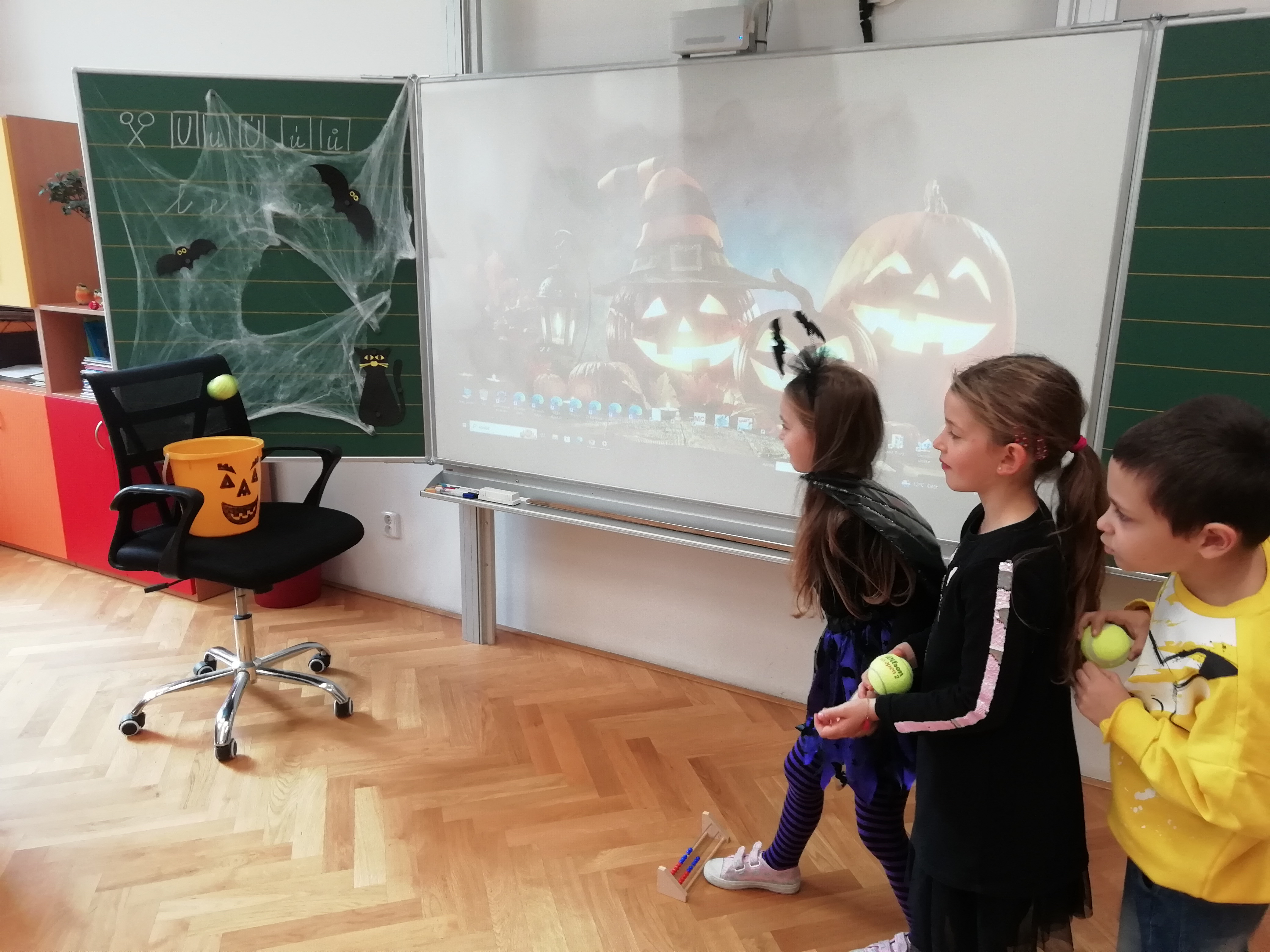 ...dnes jsme se proměnili ve strašidelnou třídu. Místo vzorných prvňáčků seděli v lavicích duchové, čarodějnice a čarodějové, upíři, černé kočky a jiná stvoření. Společné halloweenské hry se nám moc líbily a budeme se těšit na další podobnou akci.