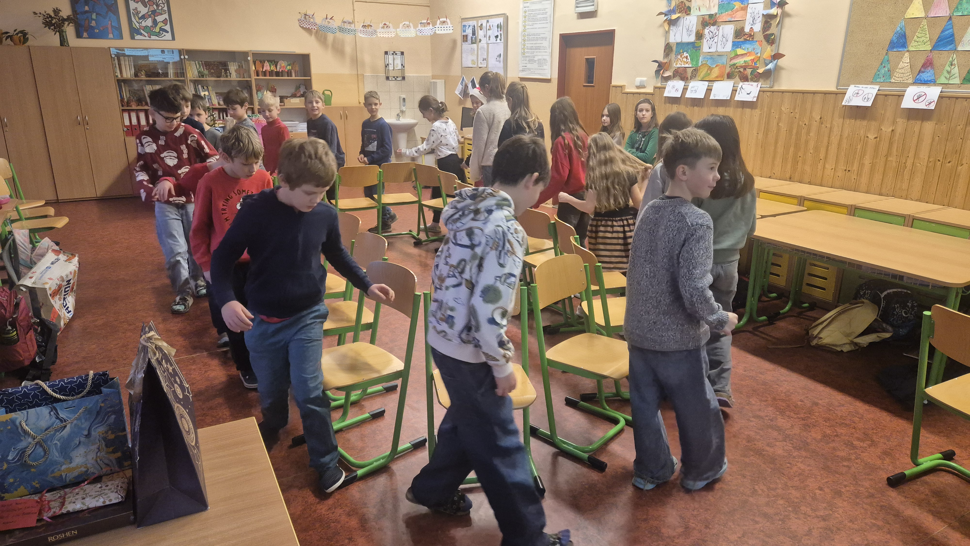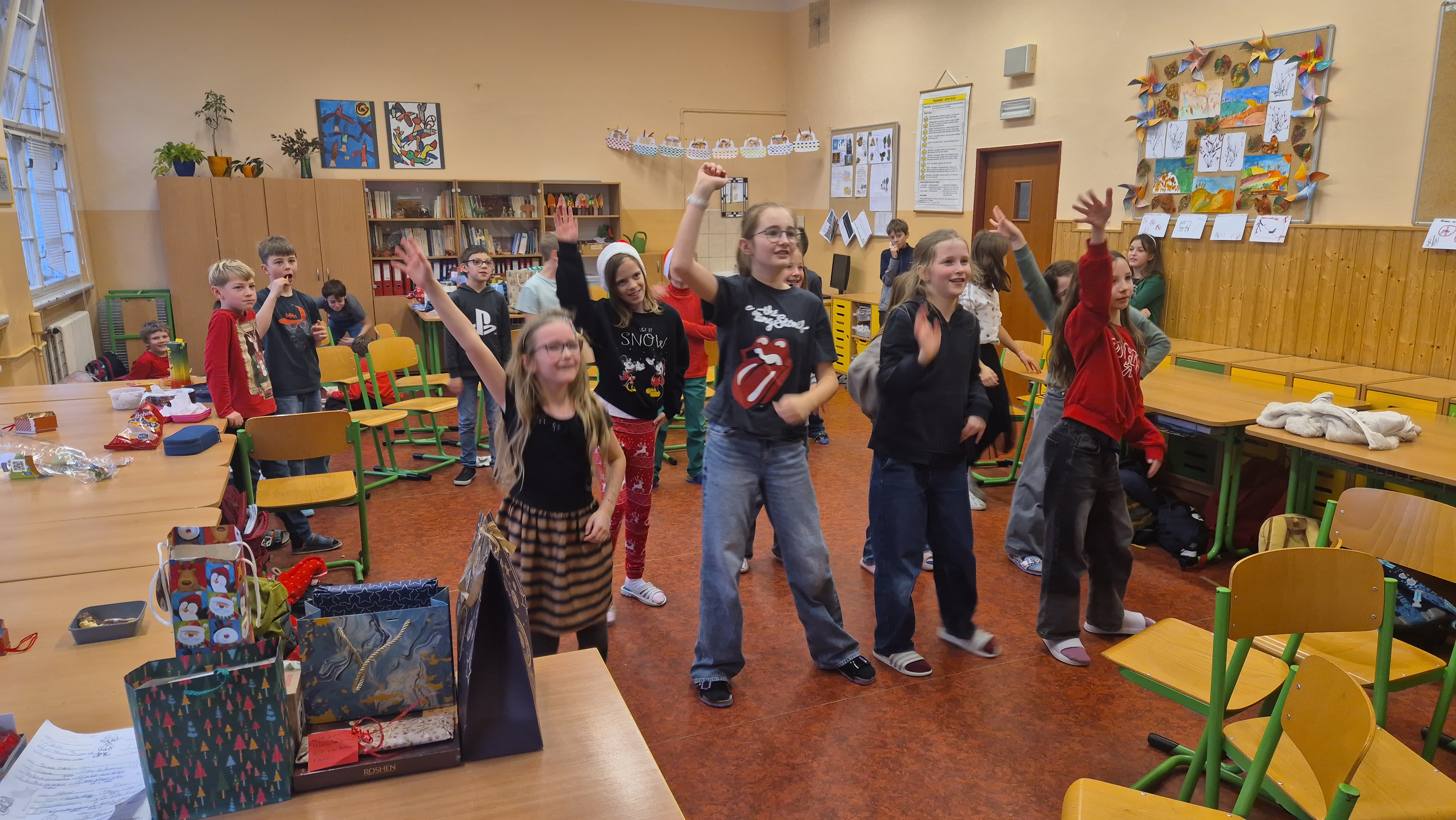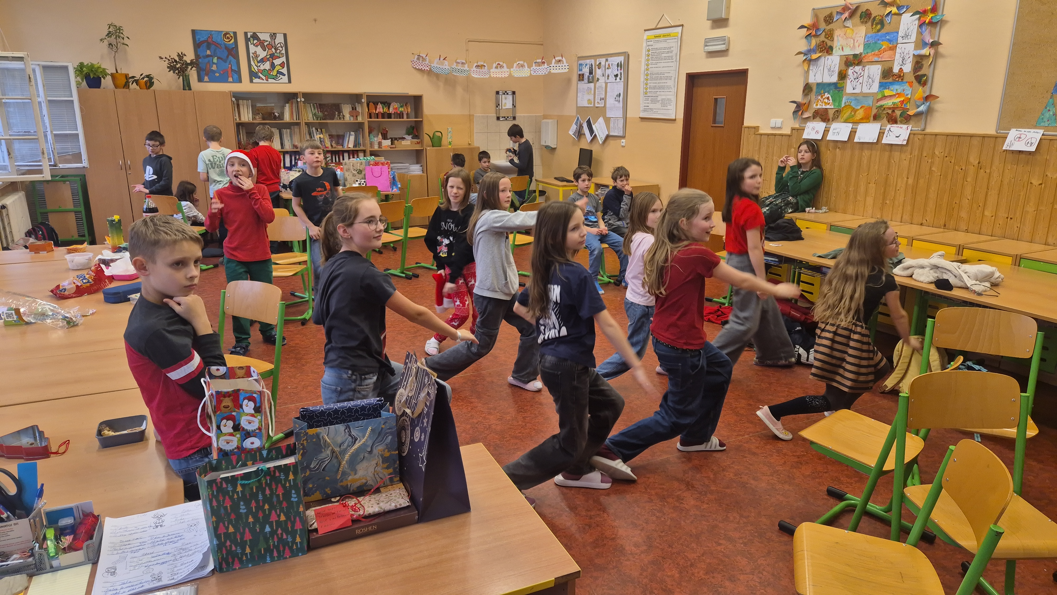 Vánoční besídka ve třídě 4. A Poslední den před vánočními prázdninami jsme si zpestřili společnými hrami, tancem a předáváním dárků. Vánoční besídka 4. A