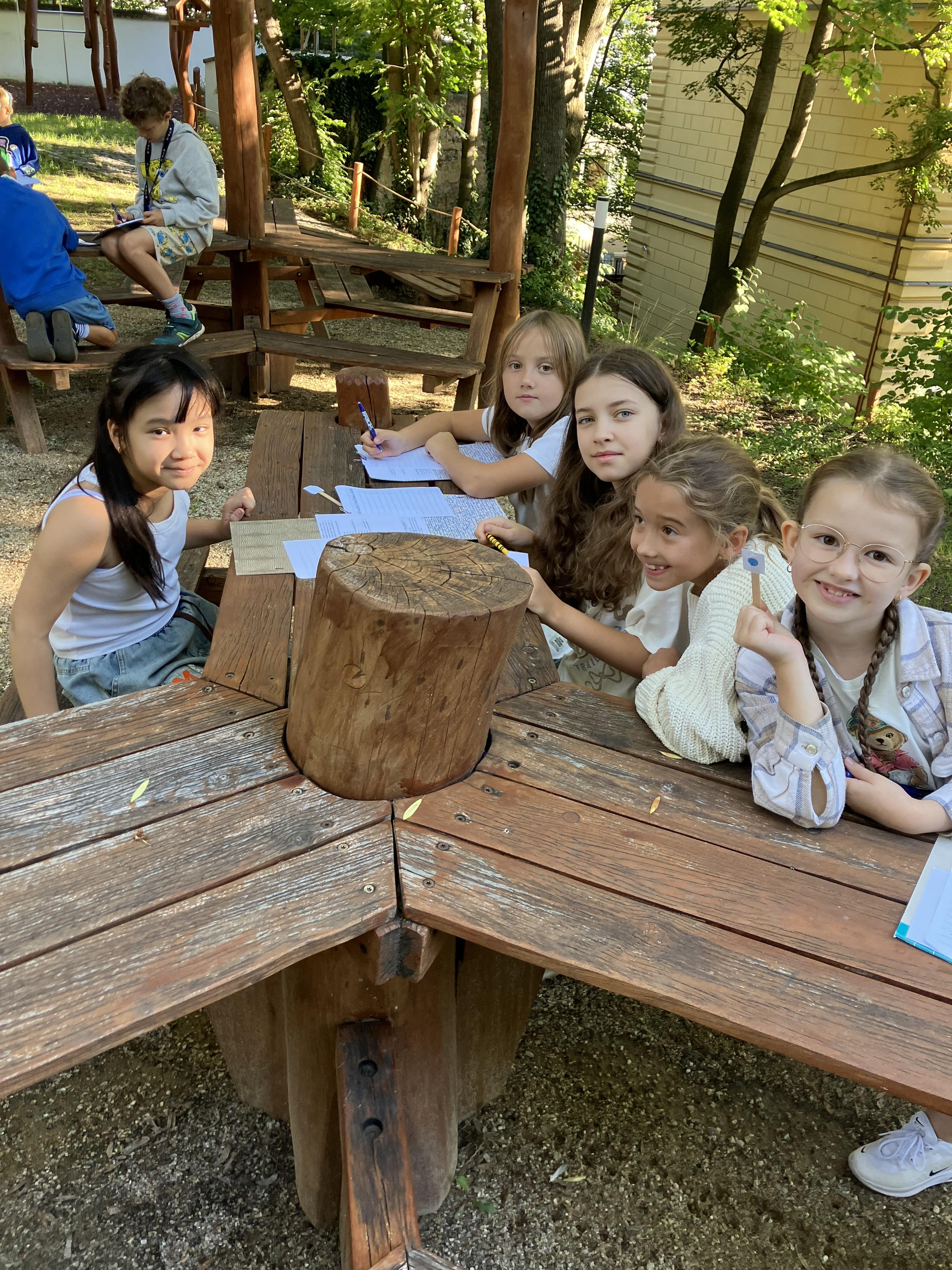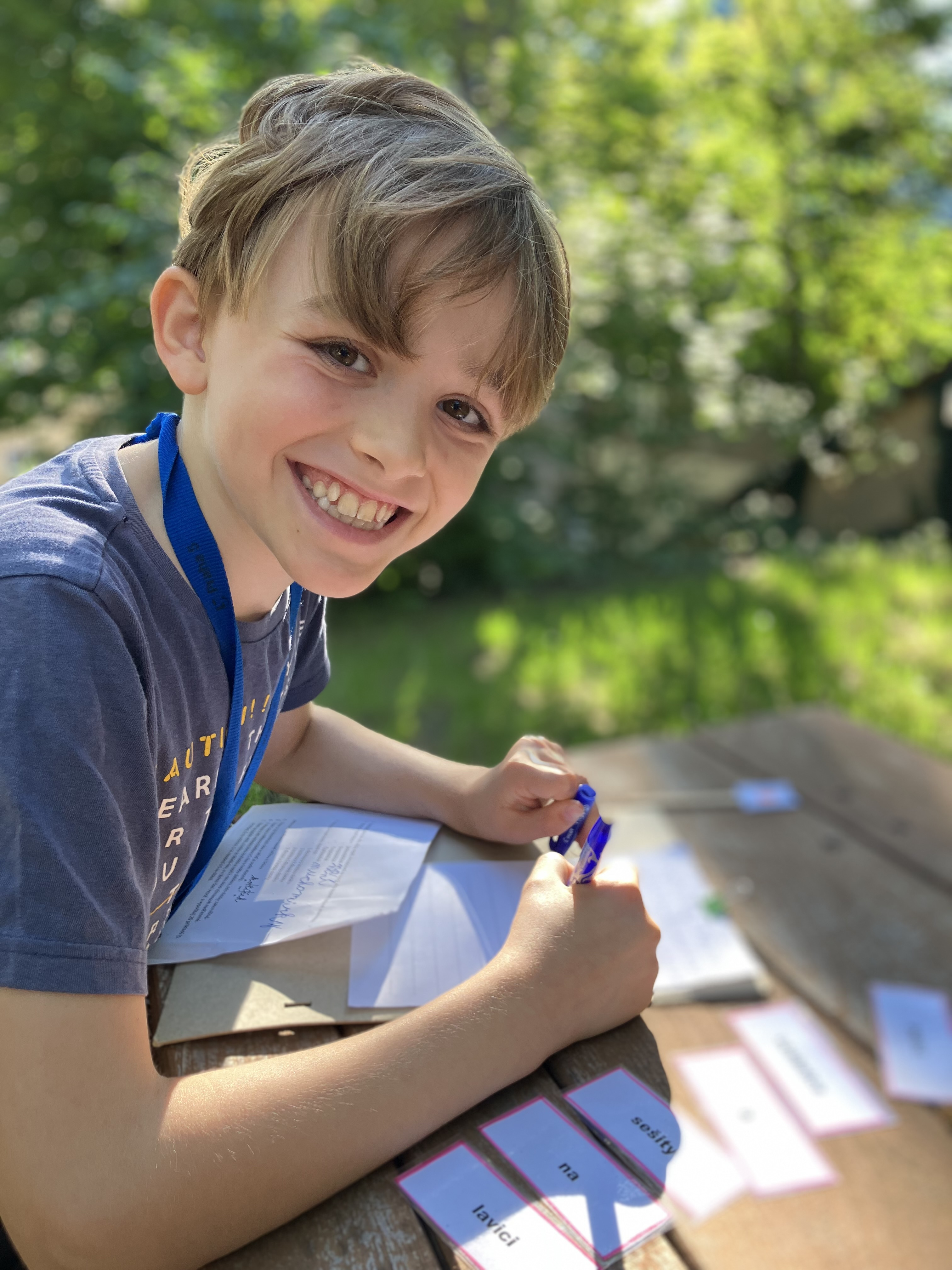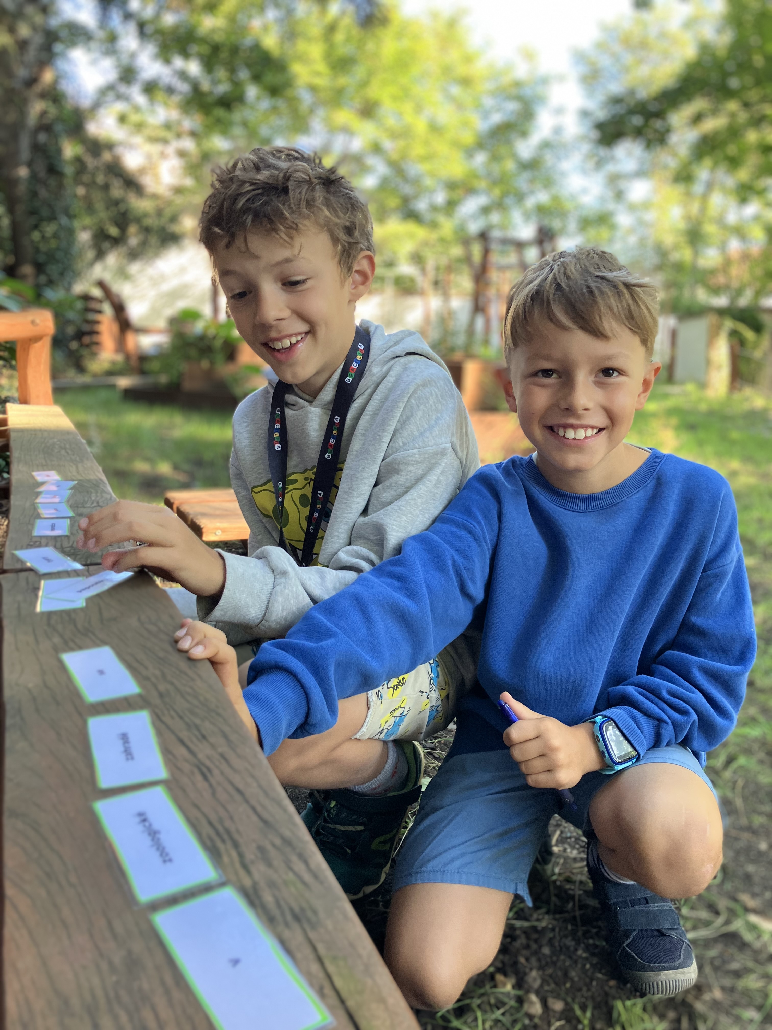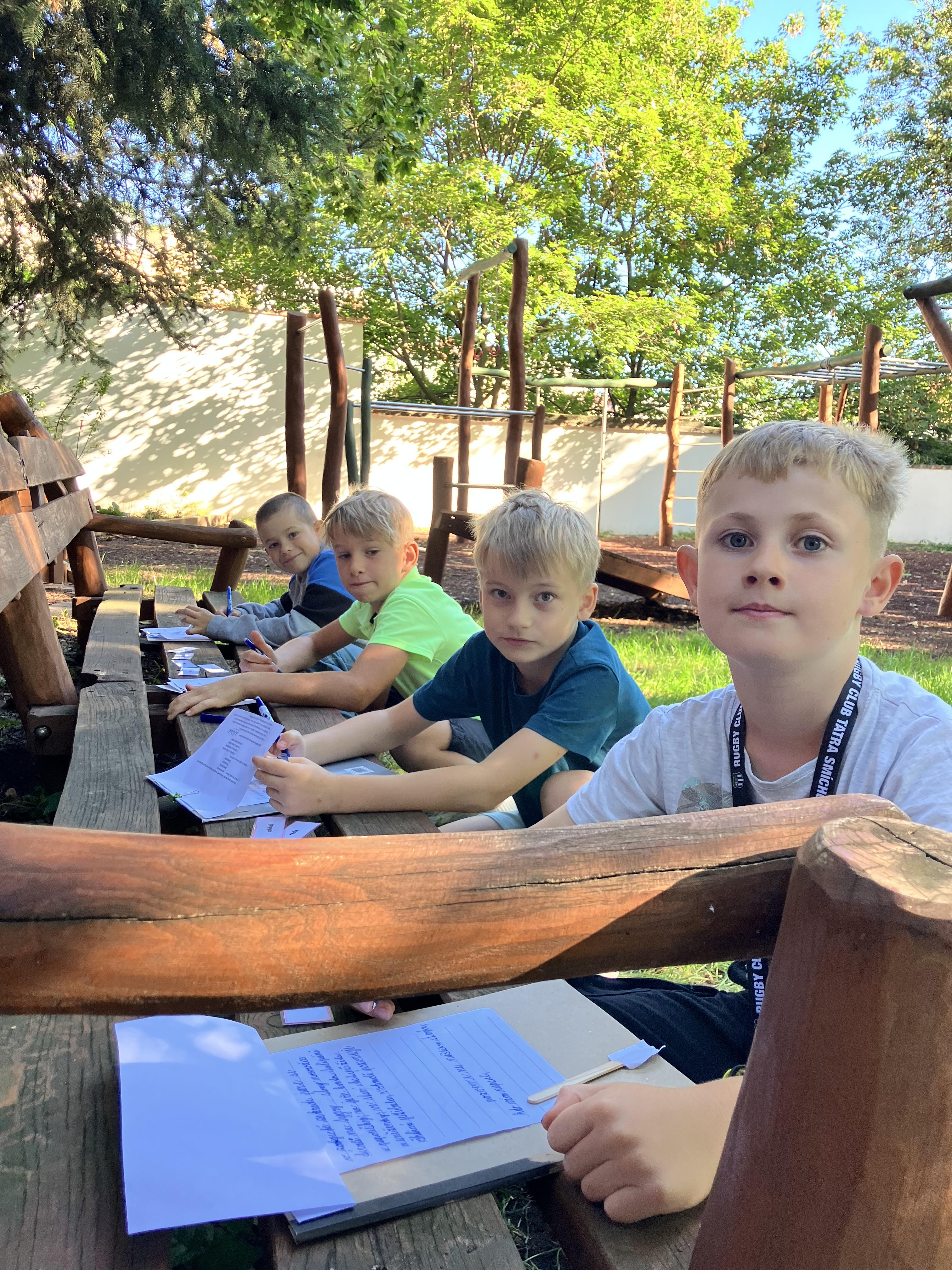 První skutečnou hodinu češtiny jsme strávili ve stínu rozložitých korun javorů naší venkovní učebny. Protože začátek září trhal teplotní rekordy a teplota ve třídě se nebezpečně zvyšovala naším pracovním zápalem, bylo rozhodnuto, že svá zpocená těla musíme neprodleně ochladit venku. Práce ve skupinách nám šla na čerstvém vzduchu pěkně od ruky.