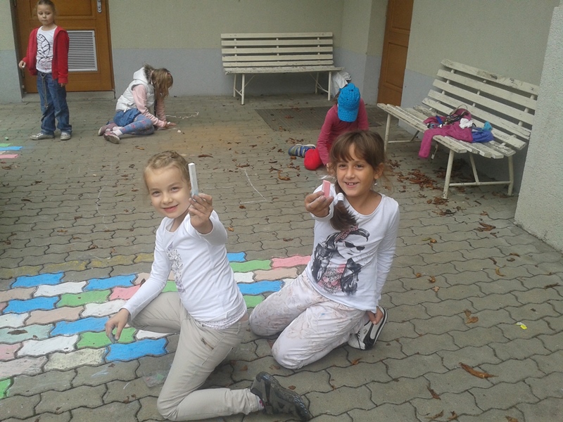 V září jsme si poskládali papírové sovičky a upletli spoustu náramků z gumiček. A venku si děvčata nakreslila barevný svět. Z těstovin jsme si vyrobili krásné obrázky. Ve Stanici přírodovědců jsme navštívili kromě zvířátek také jarmark s výrobky tělesně postižených občanů. Ze spadaných listů jsme vytvářeli růžičky.
