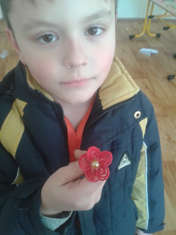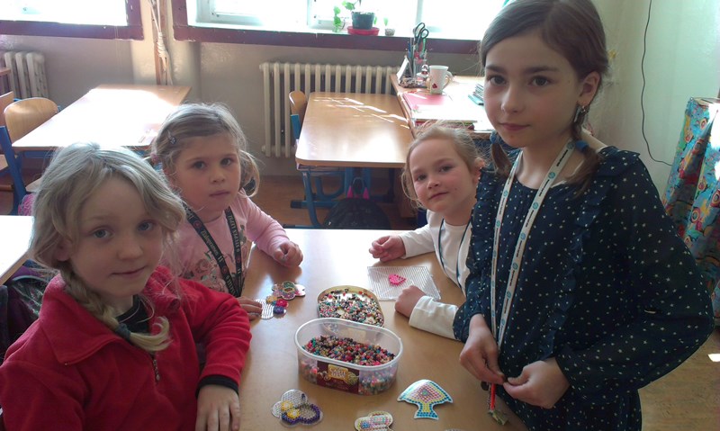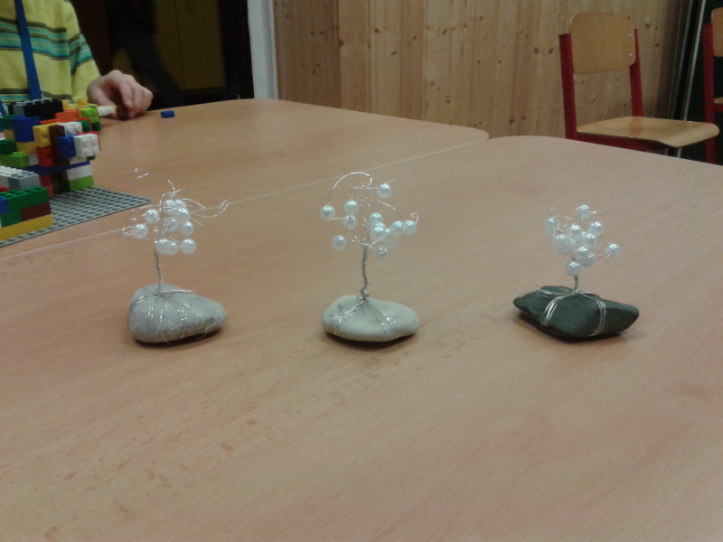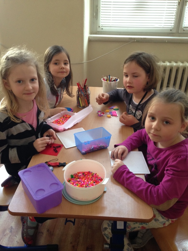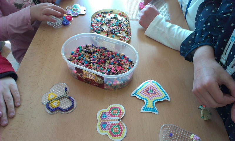 - Děti začaly opět korálkovat, dělali jsme jarní motivy a přípravu na Den matek.